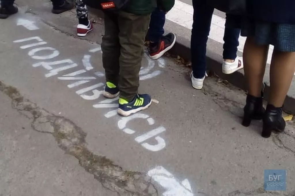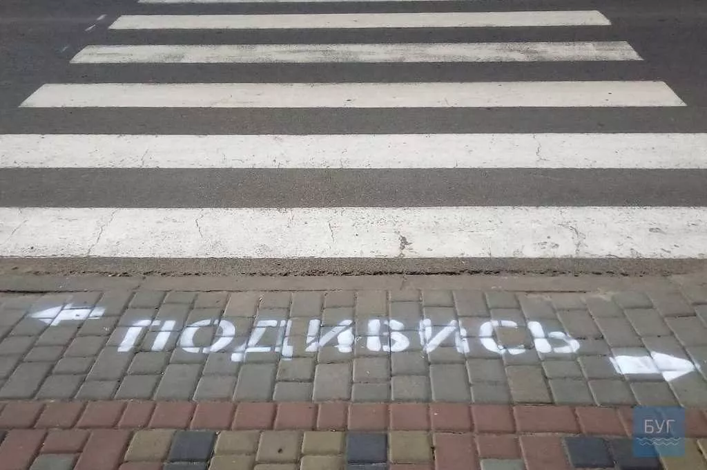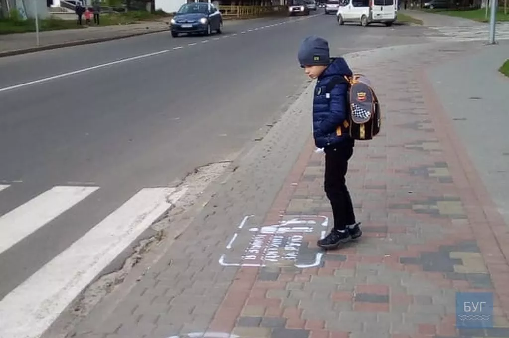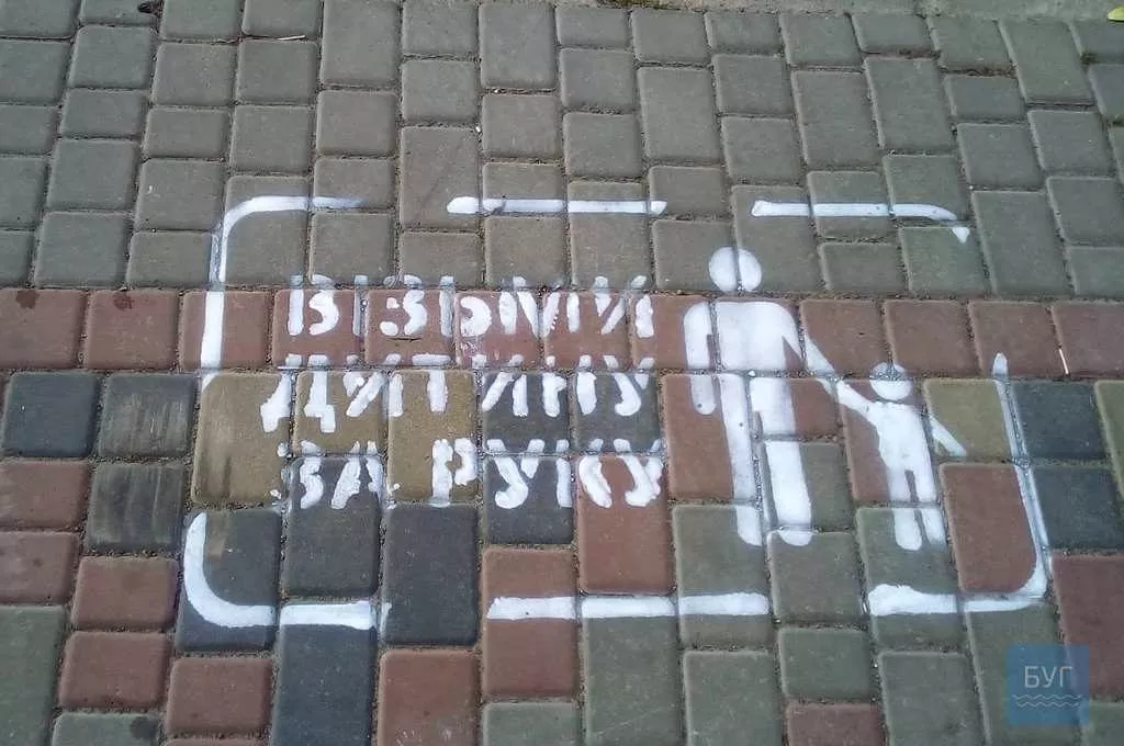 «Зніми навушники», «Візьми дитину за руку», «Подивись»: 7-го жовтня у Володимирі-Волинському на тротуарах біля пішохідних переходів неподалік місцевих шкіл з’явилися попереджувальні знаки і надписи.