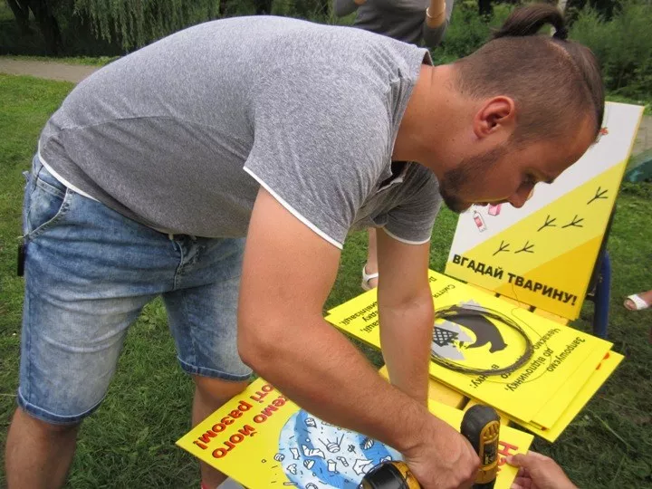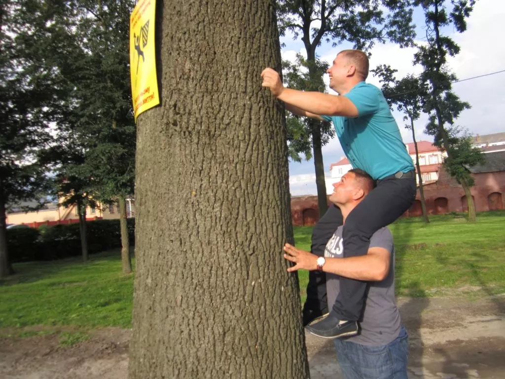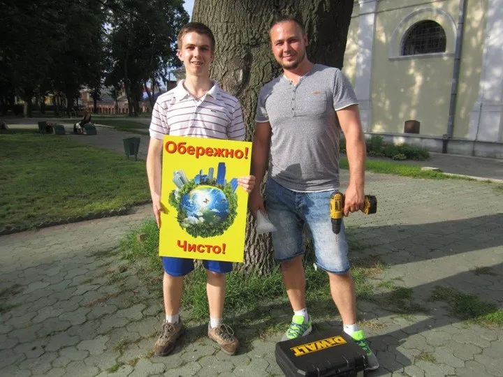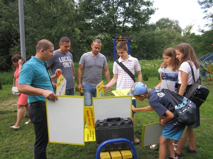 Під час встановлення до справи долучився десятирічний Артемко, котрий катався на роликах у парку. Хлопчик живе неподалік і часто проводить вільний час у Слов’янському, тож його, та поради дівчаток, які гуляли на дитячому майданчик, де краще і з яким написом таблиці повісити, згодилися. А щоб комусь не свербіли руки поздирати або зіпсувати їх, ініціаторам довелося у прямому сенсі вилазити на голови один одному, щоб розмістити таблички якомога вище.