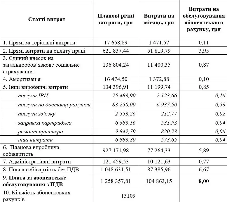 - виконання інших функцій, пов’язаних з обслуговуванням абонентів (друкування та доставка рахунків на оплату абонентам, амортизація оргтехніки, вартість затратних матеріалів для друкування квитанцій на оплату, заправка картриджів, поштові послуги).