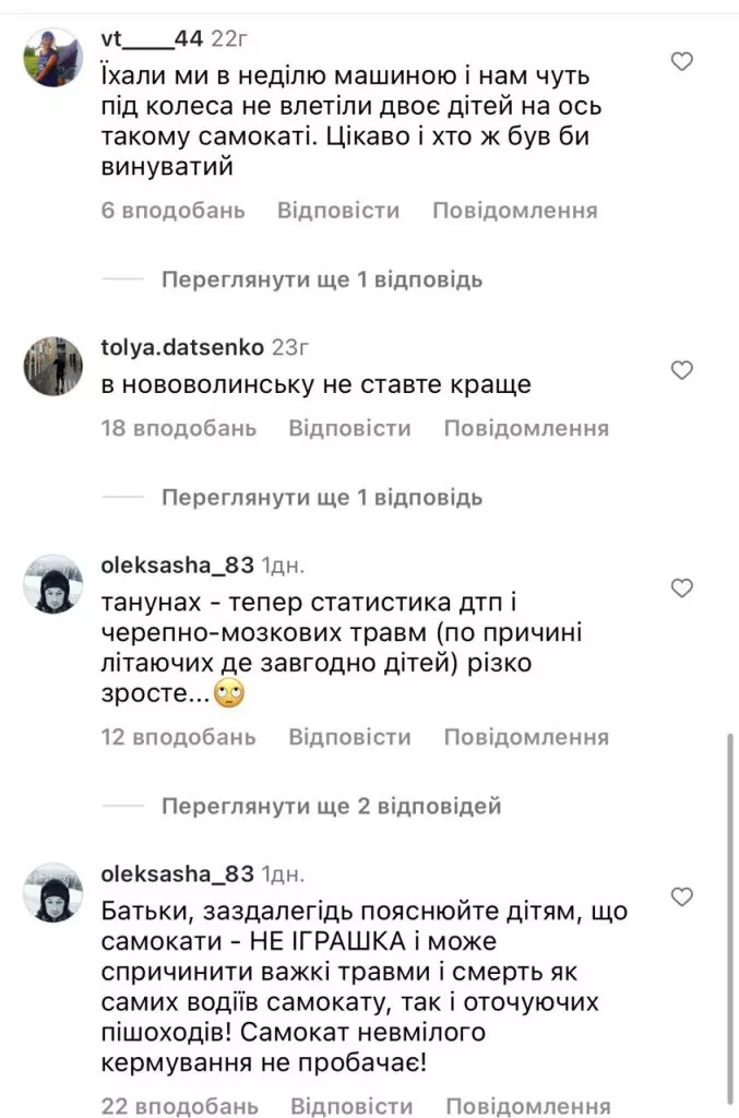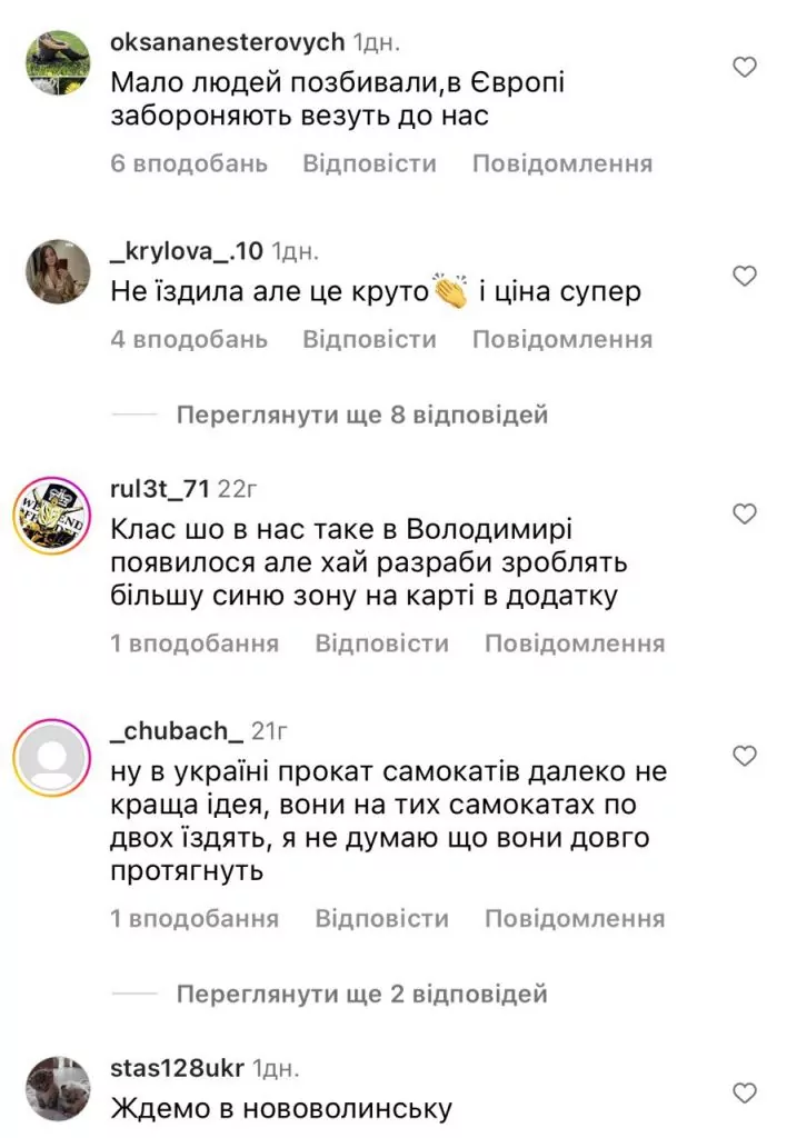 Одні радіють нововведенням, зазначаючи, що це хороша ініціатива, інші – кажуть, що у місті недостатньо облаштованих доріжок для електросамокатів. Є думки щодо того, що це призведе до збільшення кількості ДТП та закликають використовувати новинки з обережністю, а особливо дітям та просять батьків наголосити їм на правилах безпеки. А також наводять приклад Парижа, де забороняють даний вид транспорту.