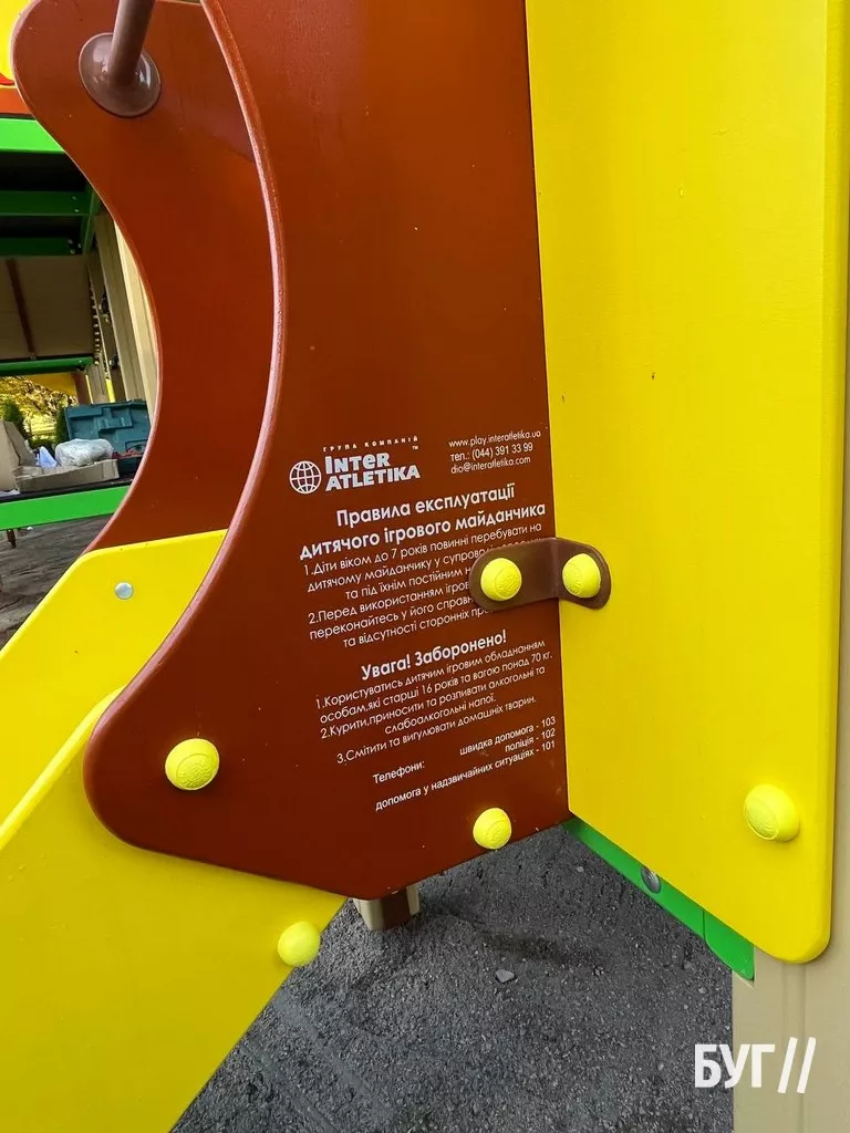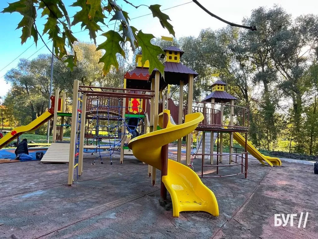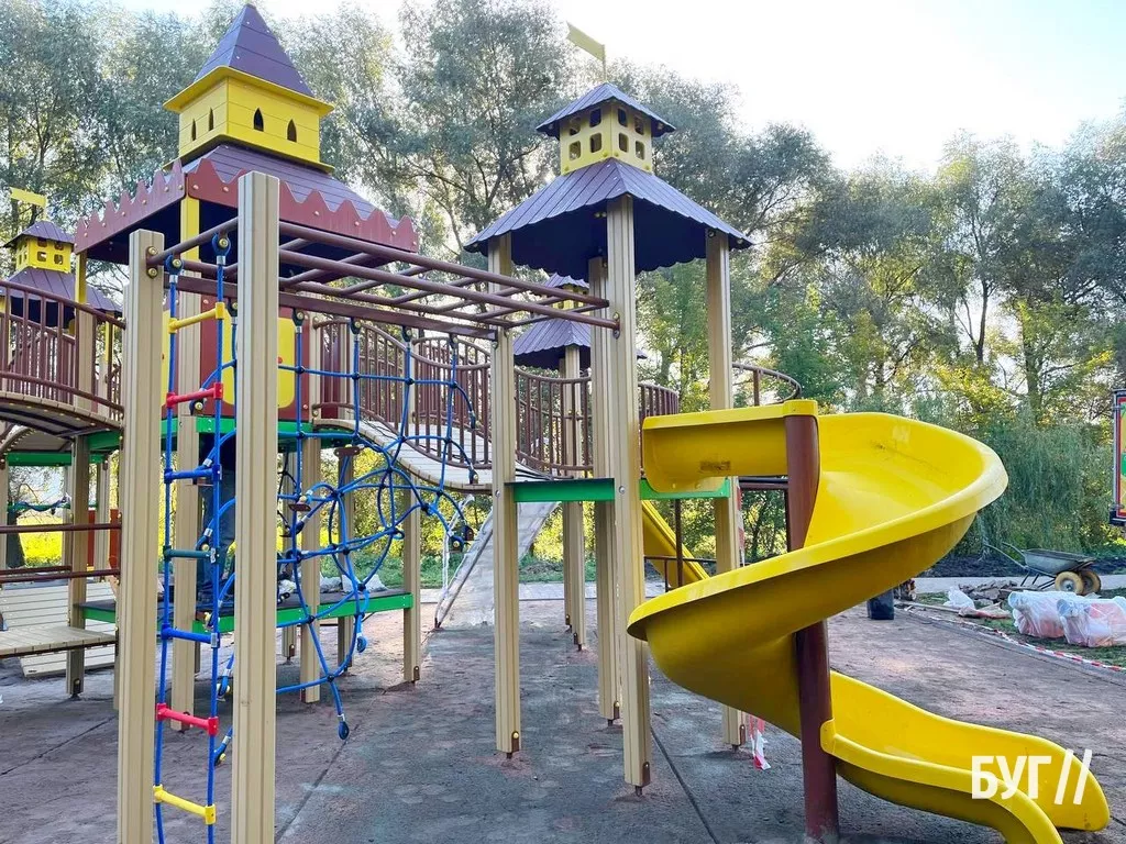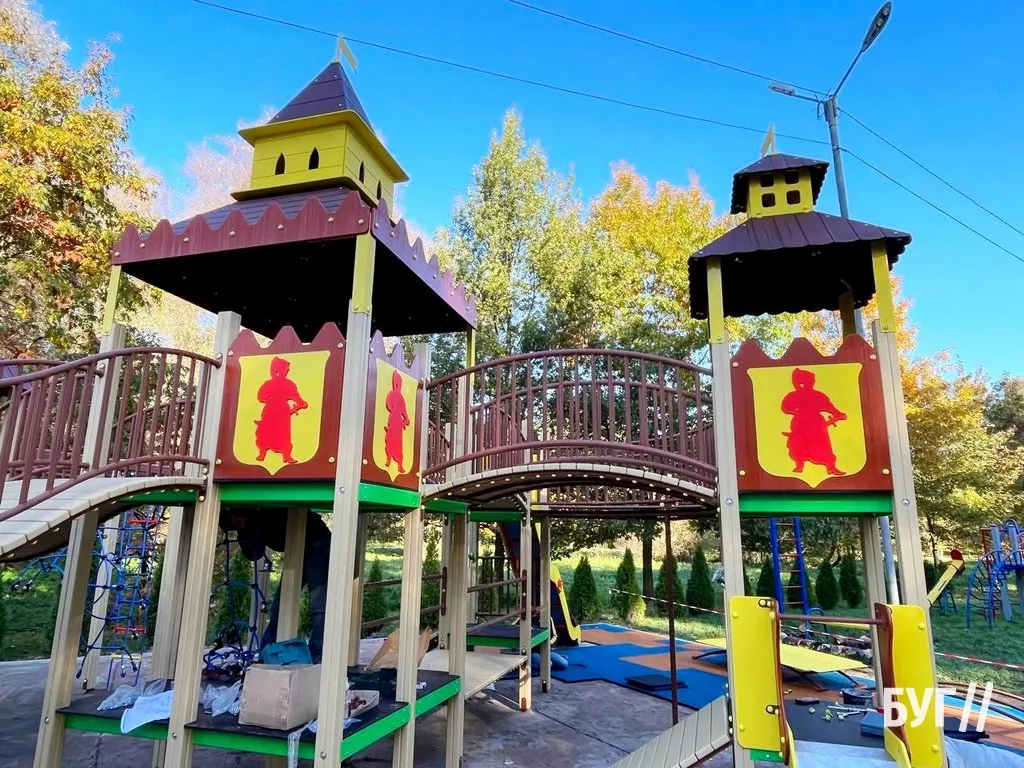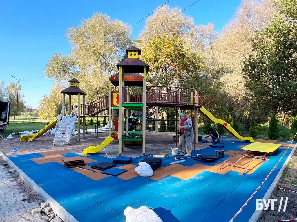 Наразі більшість конструкцій нового майданчика уже встановили. Прикріплюють декоративні та захисні елементи, а також вкладають прогумоване безпечне покриття.