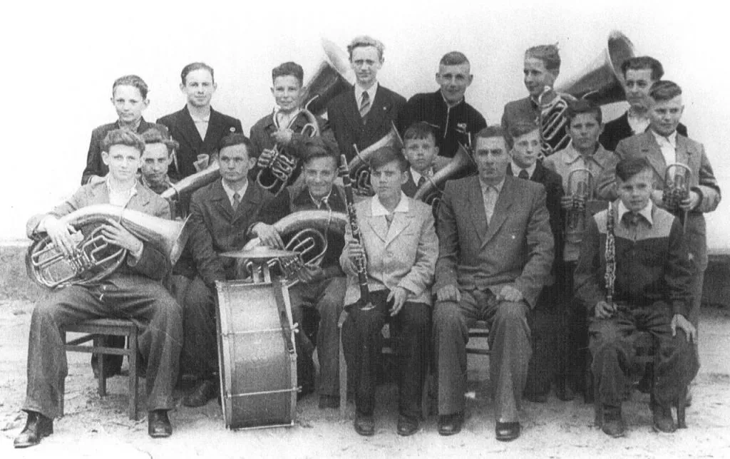 На знімку 1953 року – духовий оркестр районного будинку культури у складі 18-ти чоловік на чолі з Дмитром Михайловичем. Прізвища оркестрантів вже важко відновити. Олексій Володимирович називає лише кількох: Бесараба, котрий працював у технікумі, Тадуеша Станіславського. Четвертий у середньому ряду – Олександр (син загиблого на фронті Петра Кумецького), він керував духовим оркестром у Хобултові, працював водієм, возив голову колгоспу. На передньому плані – Дмитро і збоку від нього – Павло Михайлович, теж ветеран війни, інвалід, контужений на фронті, він прожив найдовше із братів. Перший зліва у верхньому ряду володимирський взуттєвий майстер Олександр Яскорський.