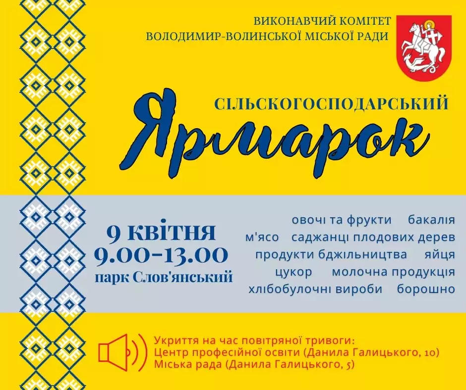 9-го квітня з 9 до 13 години на території парку «Слов’янський» міста Володимира відбуватиметься сільськогосподарський ярмарок.