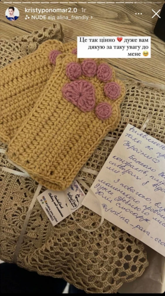 Христини Пономар подаруночок уже отримала, встигла провести «розпаковку» для своїх підписників і подякувати за чудовий виріб Юлії Слюсарук – в’язану блузку та милий «комплімент» у вигляді рукавичок.