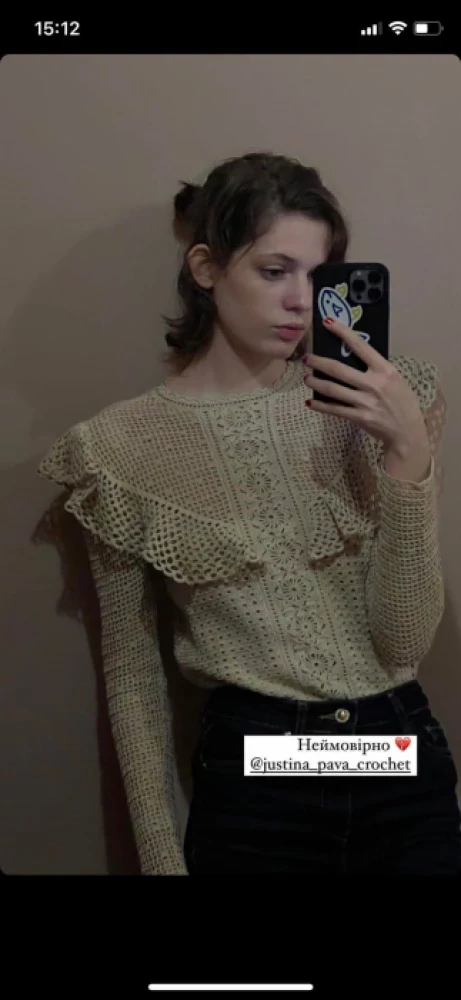 Історія така. Я сама написала їй. Слідкую за цією дівчиною в соцмережах і частенько бачу її у в’язаному одязі. Тому подумала, що, можливо, її б зацікавило щось і з мого «арсеналу». Наважилась, написала. Вона переглянула мою сторінку інстаграм @justina_pava_crochet. Їй сподобалась блузка Jane. Надіслала свої мірки. Я зв’язала, відправила. До блузочки поклала ще в подарунок рукавички.