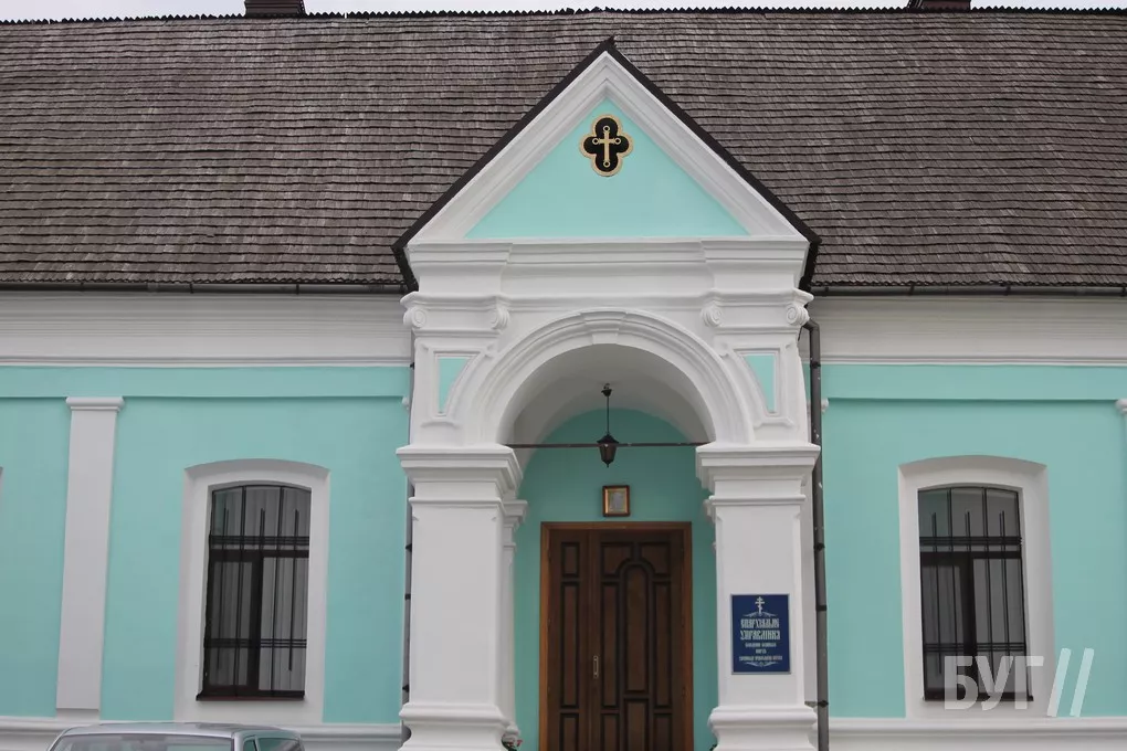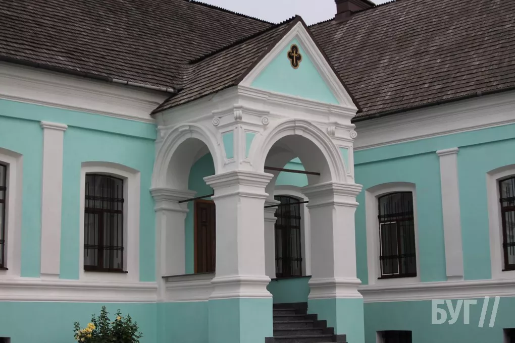 Жовта будівля зліва зараз слугує будинком для священиків, а раніше там була перша аптека міста. При монастирі був колегіум, де навчалися Феофан Прокопович – найближчий радник Петра І, Стефан Стубелевич, який першим винайшов електроферез, проте не встиг запатентувати винахід.
