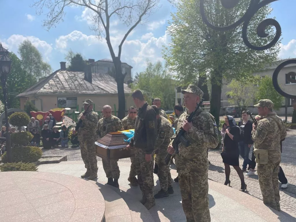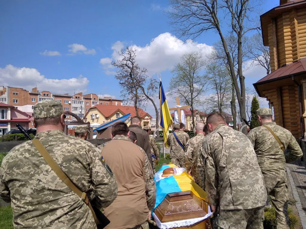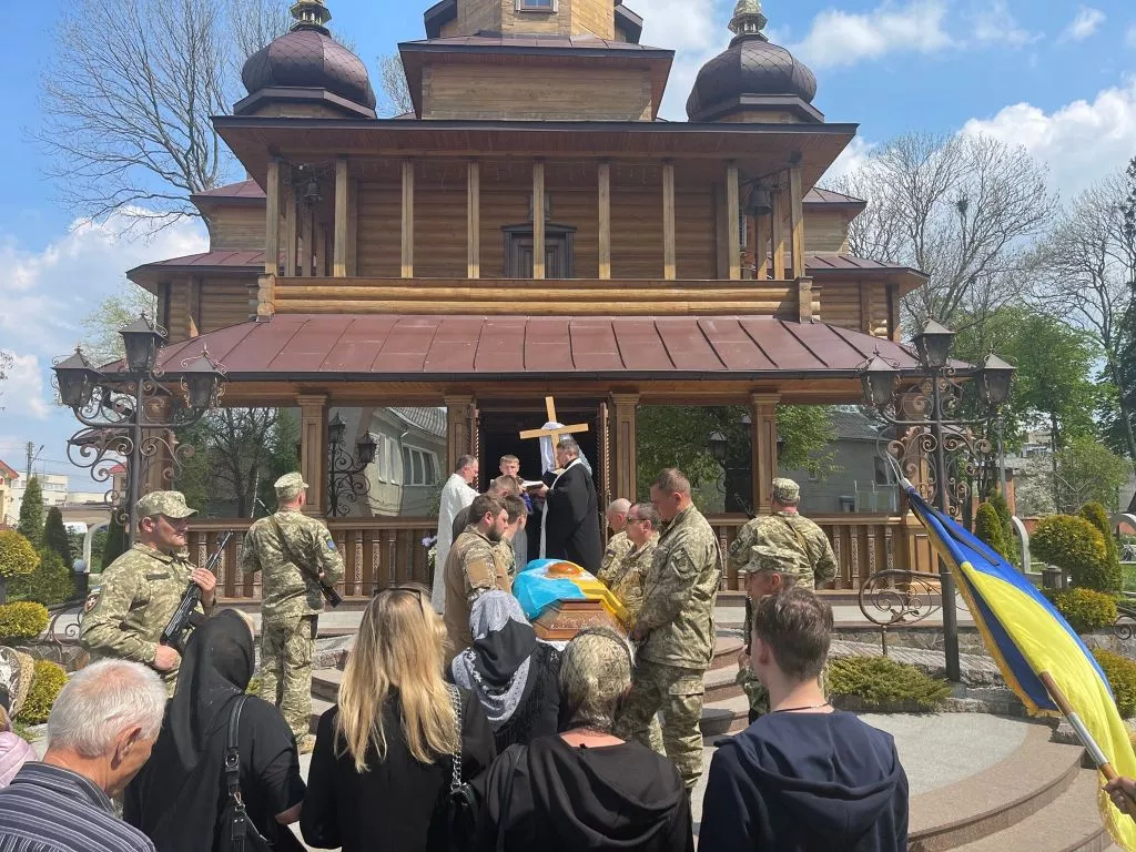 На колінах із синьо-жовтими прапорами, під звуки сирени, що сповіщала чергову тривогу, містяни зустріли кортеж із тілом воїна, який рухався своєю останньою дорогою.
