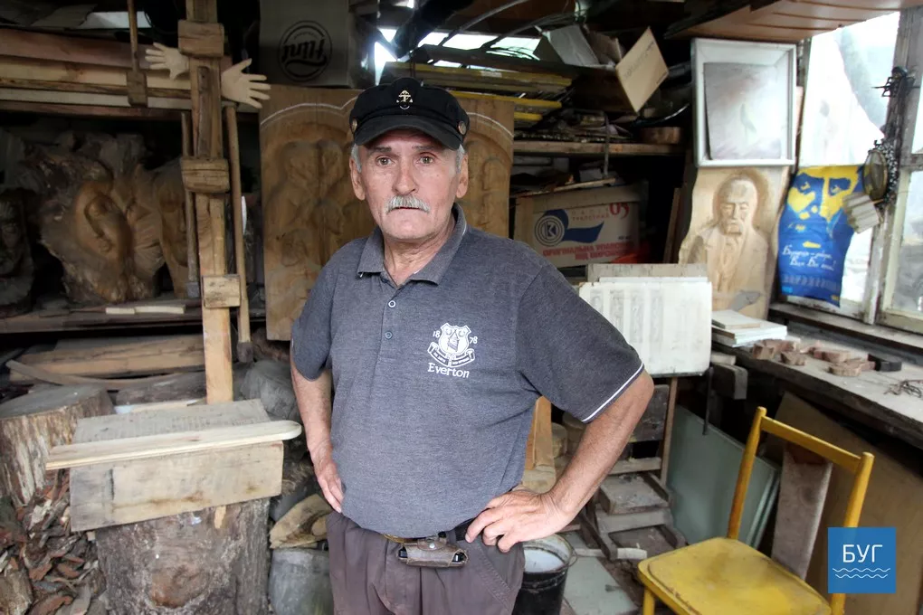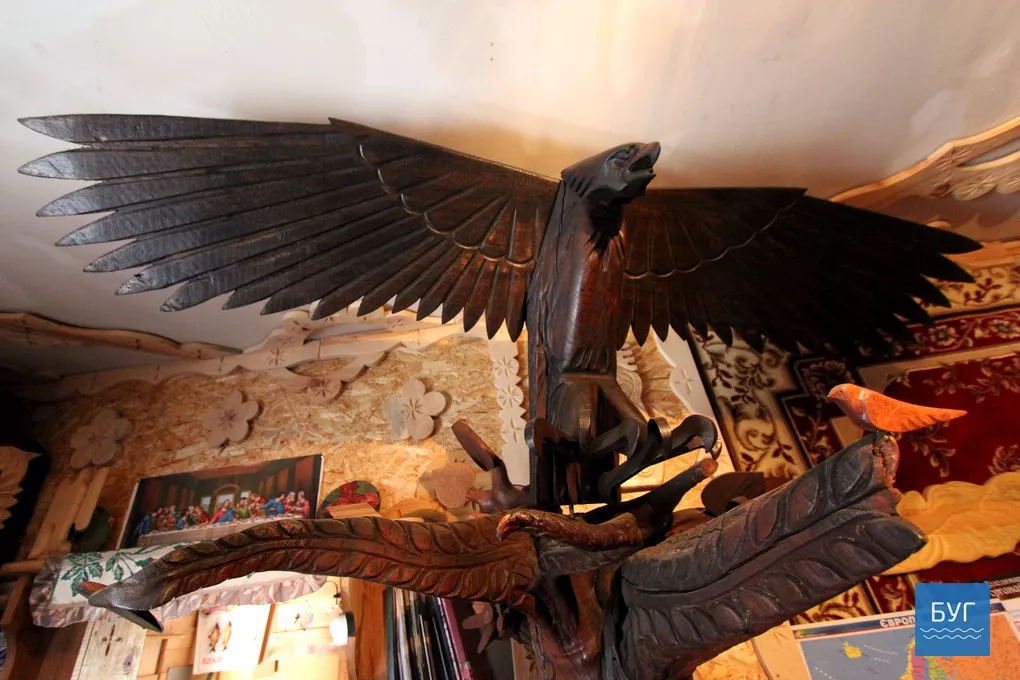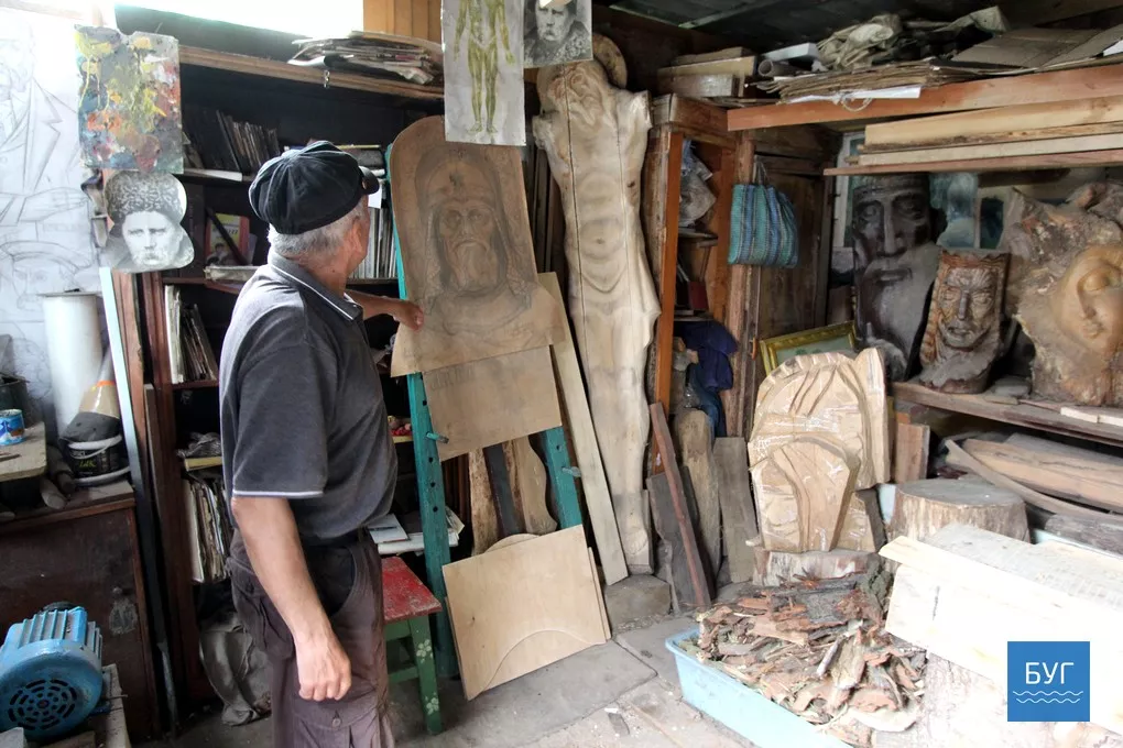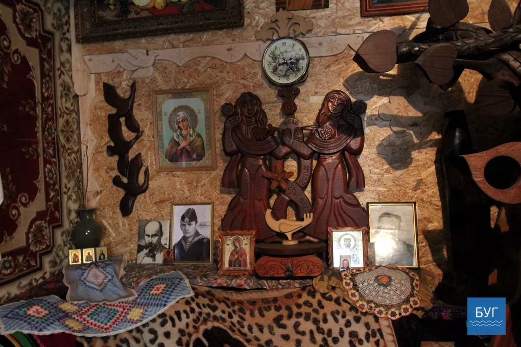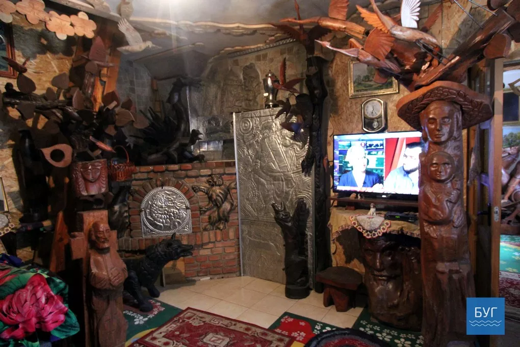 Майстер з вогнем у очах розповідає про те, як виготовив тридцять років тому «Дике поле», показує своє помешкання, де усе, навіть стеля і підлога, зроблені і декороване його руками.