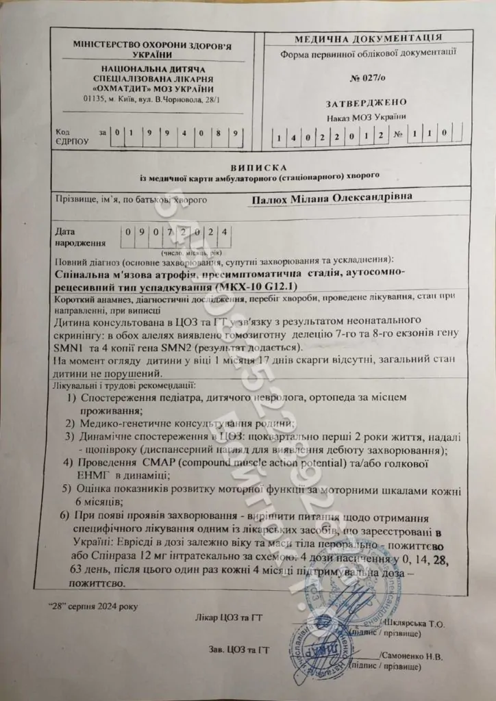 Триває збір коштів для дев’ятимісячної Міланки Палюх з Володимира, у якої лікарі діагностували рідкісне генетичне захворювання – спінально-м’язову атрофію (СМА). Недугу виявили на ранніх стадіях, тож поки вона не відібрала сили у дівчинки, її можна зупинити. Єдиний шанс на порятунок – найдорожчий у світі укол Zolgensma. Проте часу, щоб зібрати 1 мільйон 800 тисяч євро стає все менше, адже дитина підростає. Ці кошти для родини немовля – непідйомні. Тому вона звертається за допомогою до небайдужих.
