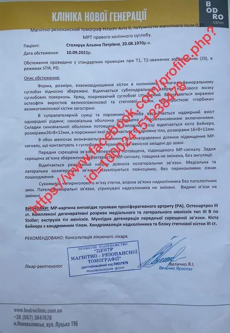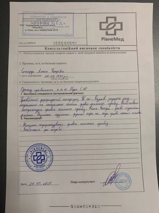 Володимирчанка хворіє з 2004-го року ревматоїдним артритом. Її діагноз – правобічний деформуючий коксартроз третього ступеню; розрив заднього рогу медіального та латеріального менісків правого колінного суглобу.