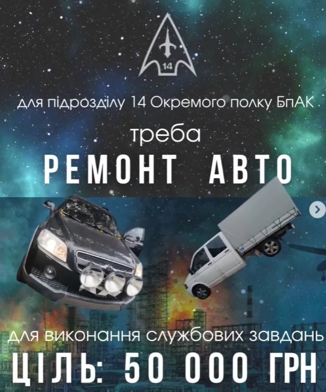 Військова з 14-го окремого полку БпАК, підрозділу, що здійснює успішні атаки по об’єктах військово-промислового комплексу рф, звернулася з проханням допомогти зібрати 50 000 гривень на ремонт бойового автомобіля.