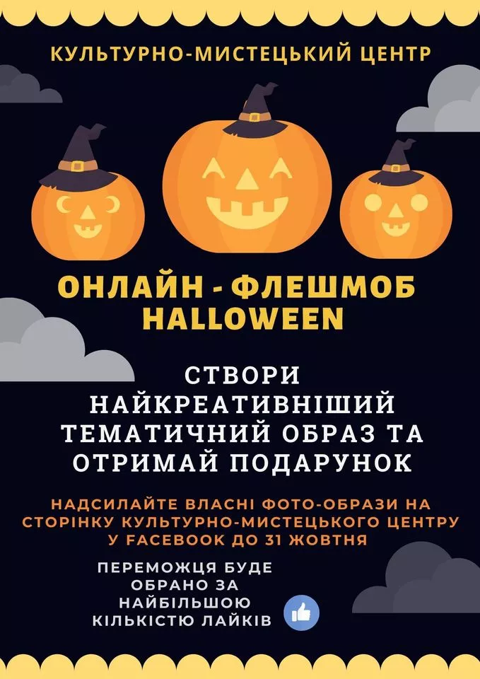 “Привіт друзі! І знову ми продовжуємо нашу рубрику онлайн-флешмоб до свят, які наближаються. Всі знають, що наближається Хелловін, який відзначається 31-го жовтня. І ми разом з командою культурно-мистецького центру підготували для вас флешмоб! Усі умови ви зможете прочитати на афіші! Отож, запрошуємо Вас приєднатися до флешмобу!”, – йдеться в дописі.
