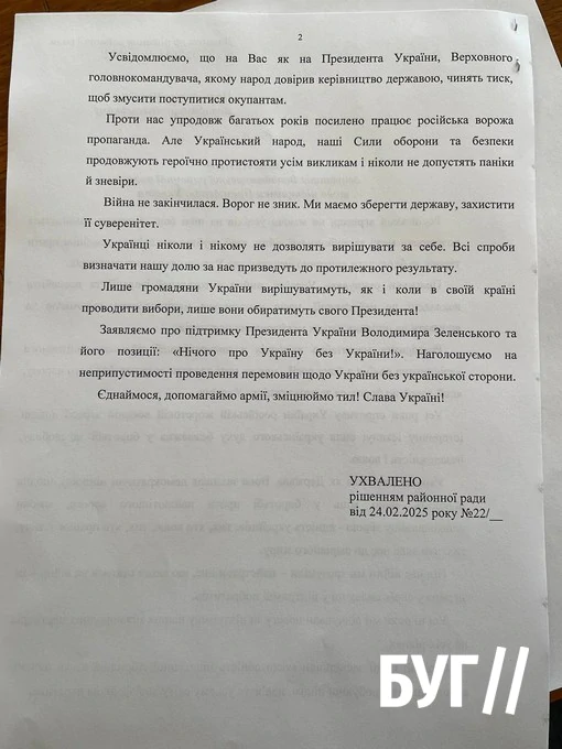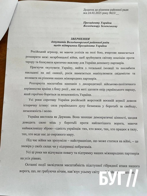 “Заявляємо про підтримку Президента України Володимира Зеленського та його позиції: «Нічого – про Україну без України!». Наголошуємо на неприпустимості проведення перемовин щодо України без української сторони”, – йдеться в проєкті рішення Володимирської районної ради.