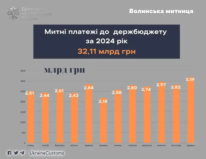 У грудні минулого року у зоні діяльності Волинської митниці бізнес та громадяни перерахували до державного бюджету 3 млрд 188 млн гривень митних платежів. Ця сума стала найвищим показником у помісячному розписі і більше рівня грудня 2023 року на 30 відсотків.