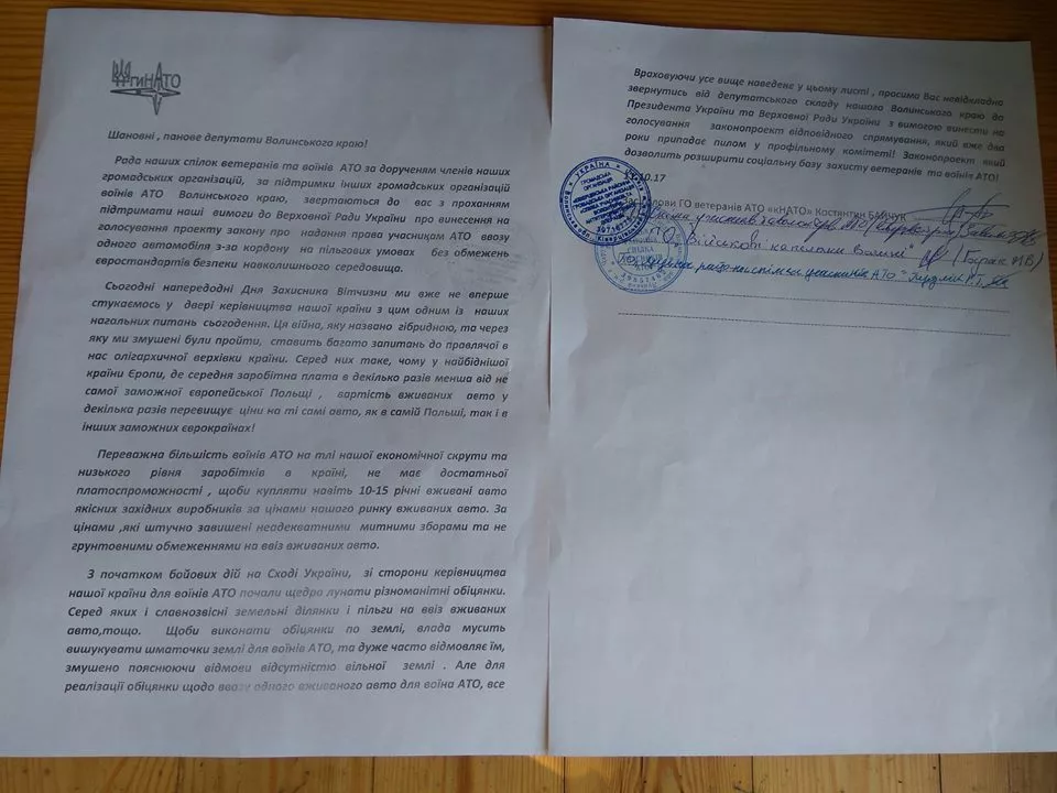 “Просимо депутатів Волині підтримати вимоги до Верховної Ради України та Президента про винесення на голосування проекту закону стосовно надання права учасникам АТО ввозу одного автомобіля з-за кордону на пільгових умовах, як закону, який розширив би соціальну базу захисту ветеранів та воїнів АТО!”, – йдеться в дописі.