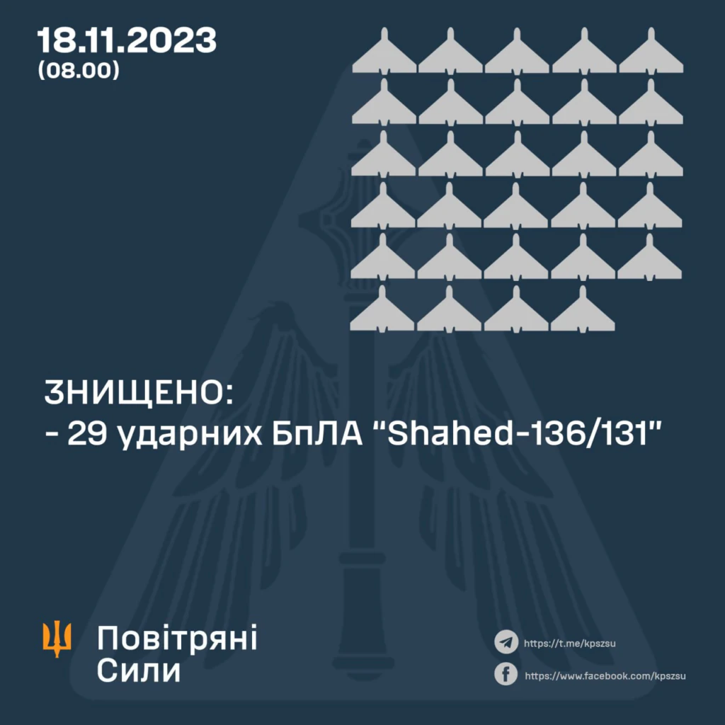 До відбиття повітряного нападу залучено авіацію, зенітні ракетні війська, мобільні вогневі групи Повітряних Сил та Сил оборони України. У результаті протиповітряного бою знищено 29 ударних БпЛА «Shahed-136/131».
