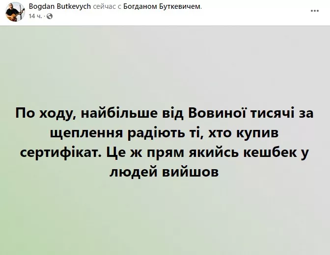 “Тут почалися жарти про Вовину і Юліну тисячу. Хтось вже написав про популізм, але насправді схожого мало. І мені подобається така ініціатива, бо: це буде додатковим стимулом для вакцинації; це виділення коштів для громадян, які можна буде витрати тільки в певних секторах економіки, і це сектори, які чи не найбільше постраждали від локдауну.