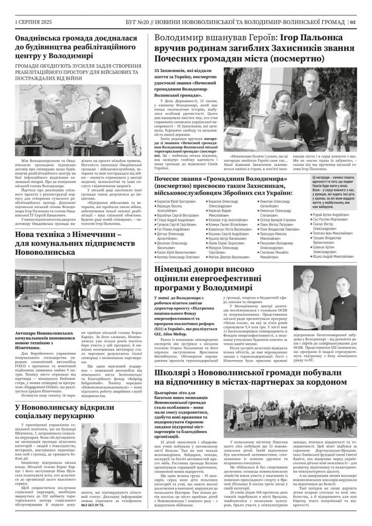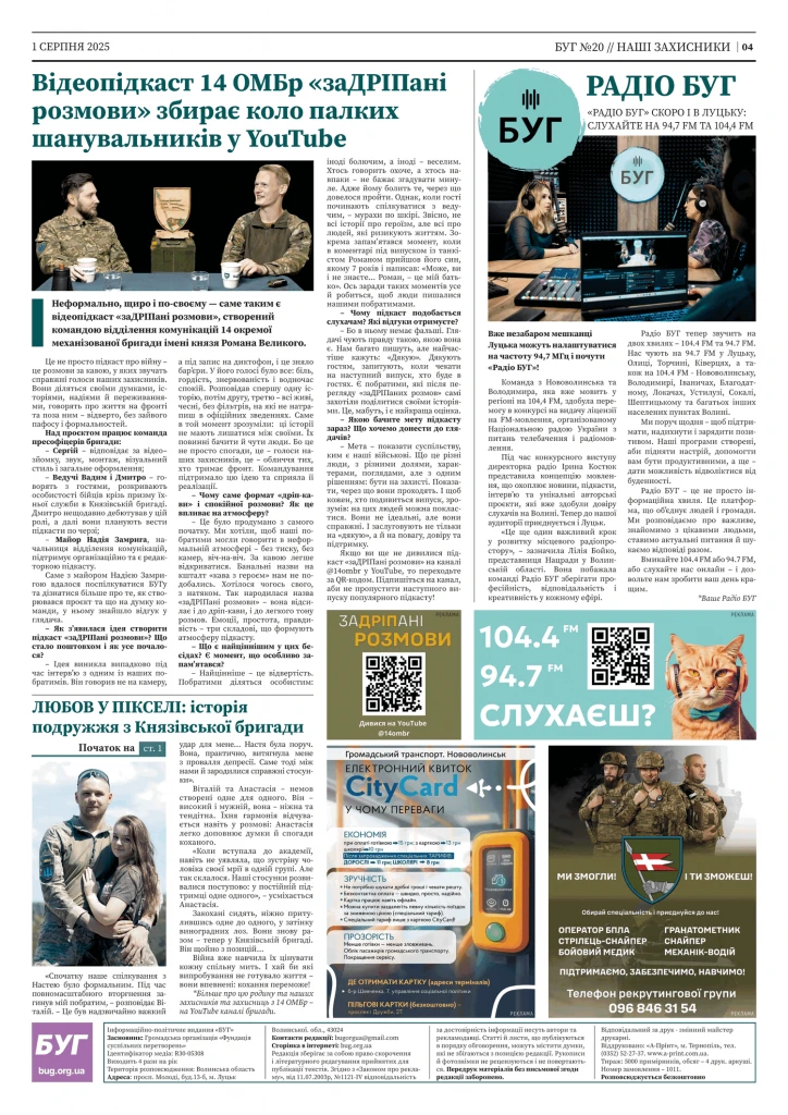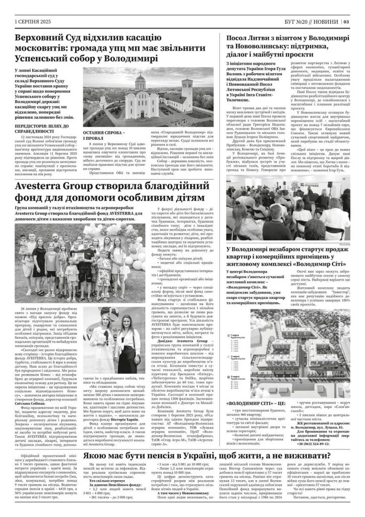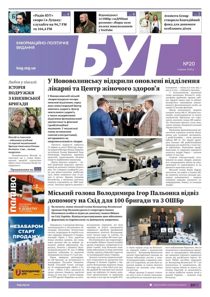 1 серпня вийшов друком 20-й номер інформаційно-політичного видання «БУГ». Цього разу газета зібрала найважливіші події громад Володимира та Нововолинська, розповіла про людей, які творять сучасну історію, і зазирнула туди, де зосереджені виклики та надії сьогодення.