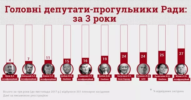 Зокрема, за три роки Ярош (позафракційний) відвідав 4% засідань парламенту, Білецький (позафракційний) – 7%, С. Клюєв (позафракційний) – 11%, М. Добкін (Опоблок) – 15%, Онищенко (позафракційний) – 16 %, Д. Добкін (Опоблок) – 19%, Богуслаєв ( “Воля народу”) – 24%, Чепинога (БПП) – 24%, Льовочкіна (Опоблок) – 25%, Жеваго (позафракційний) – 27%.