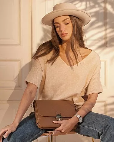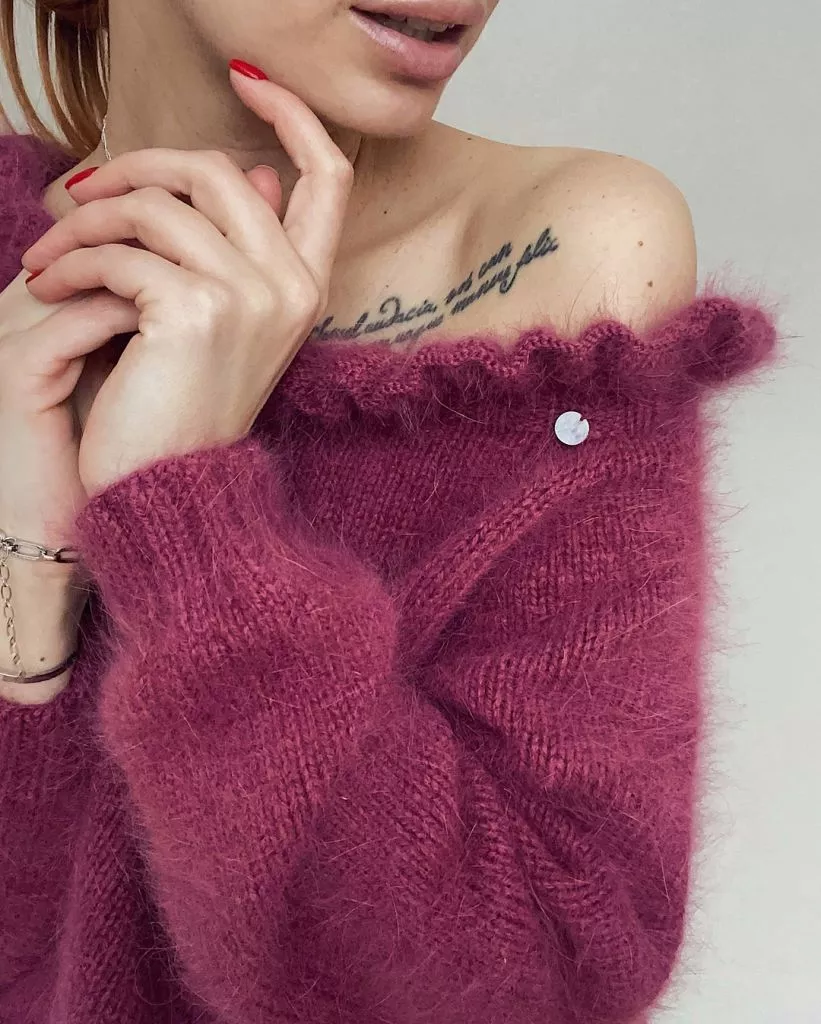 Ще один варіант – джемпер з подвійним укороченим рукавом-манжетом і V-подібним вирізом у зоні декольте. З такою річчю можна створити як діловий образ, так і в стилі casual. Стильним буде лук, що складається з джинсів, такого джемпера, капелюха з широкими полями і маленькою сумочкою-клатчем.