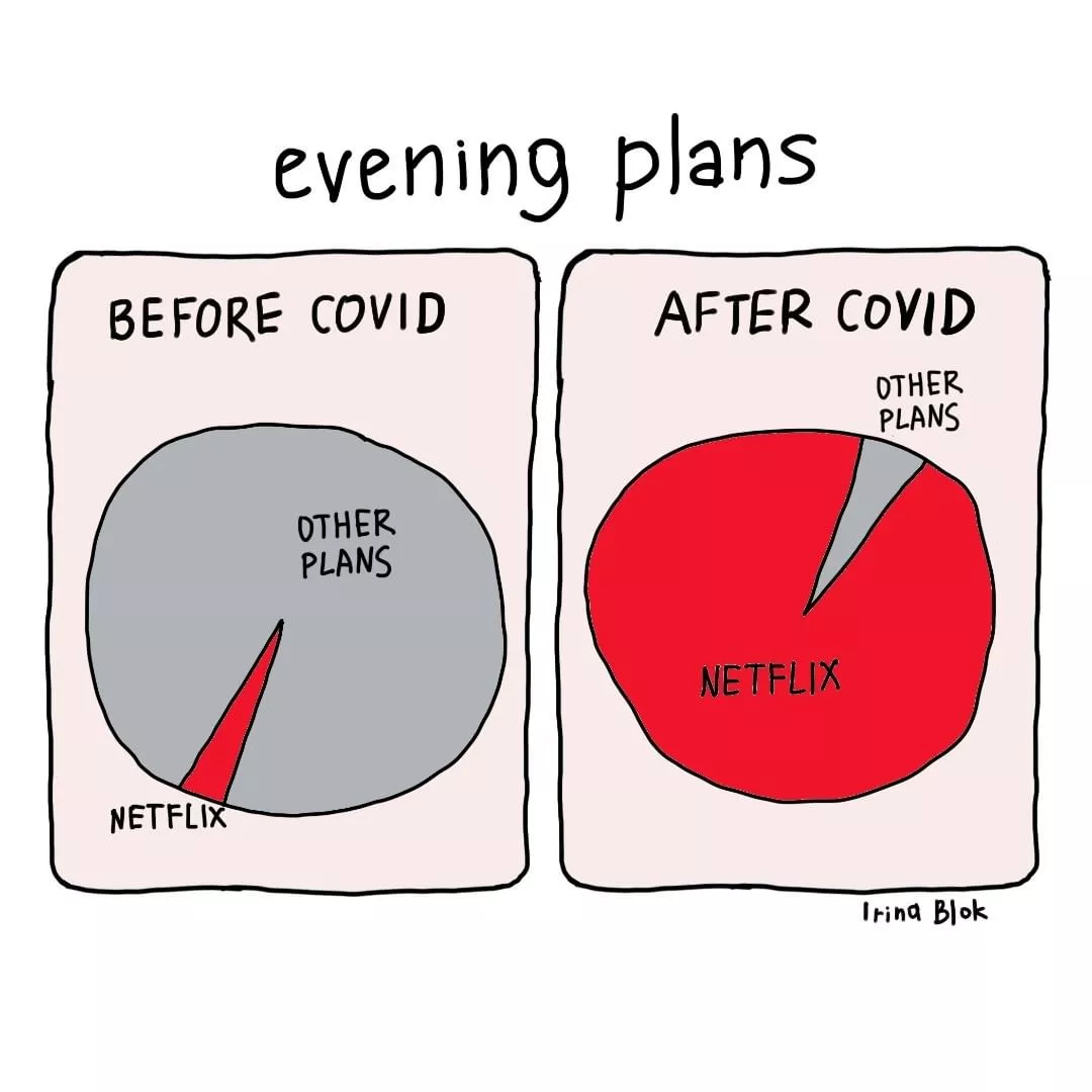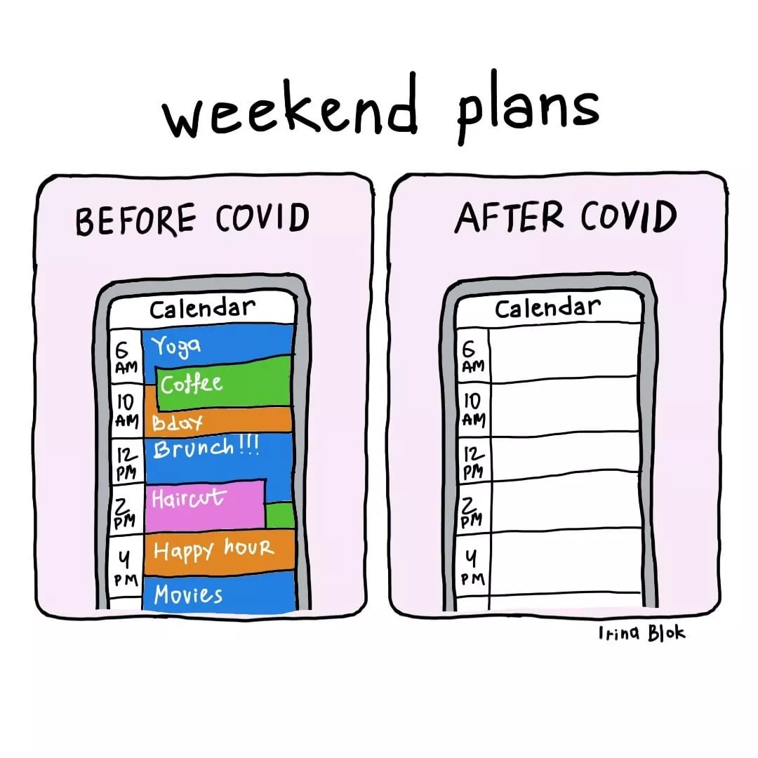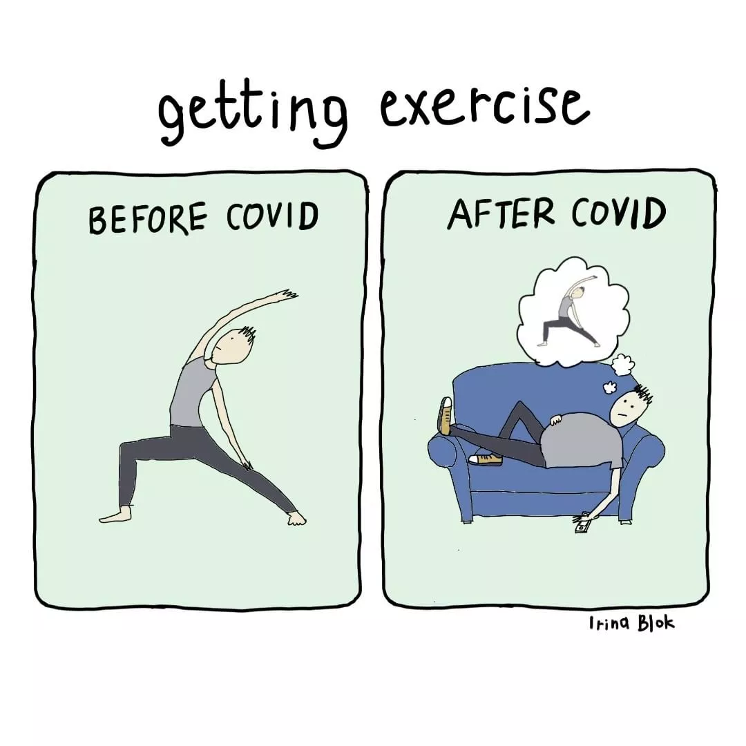 Ірина Блок з Сан-Франциско створила гумористичні ілюстрації, які показують, як коронавірус змінив наше життя. Серія її робіт називається Covid Life, і в ній розповідається про повсякденні проблеми і про те, як змінилися майже всі аспекти життя – харчування, подорожі, покупки, сімейні свята й так далі.