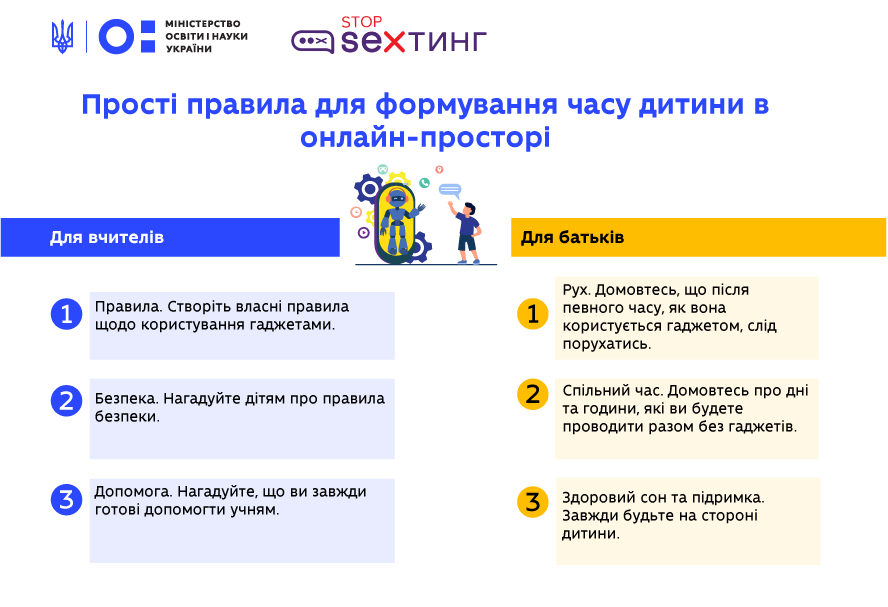 Міністерство освіти і науки спільно з проєктом Stop_sexтинг, який займається захистом дітей від сексуального насильства в інтернеті, розробили поради для вчителів і батьків, як вони можуть допомогти дітям безпечно проводити час онлайн.