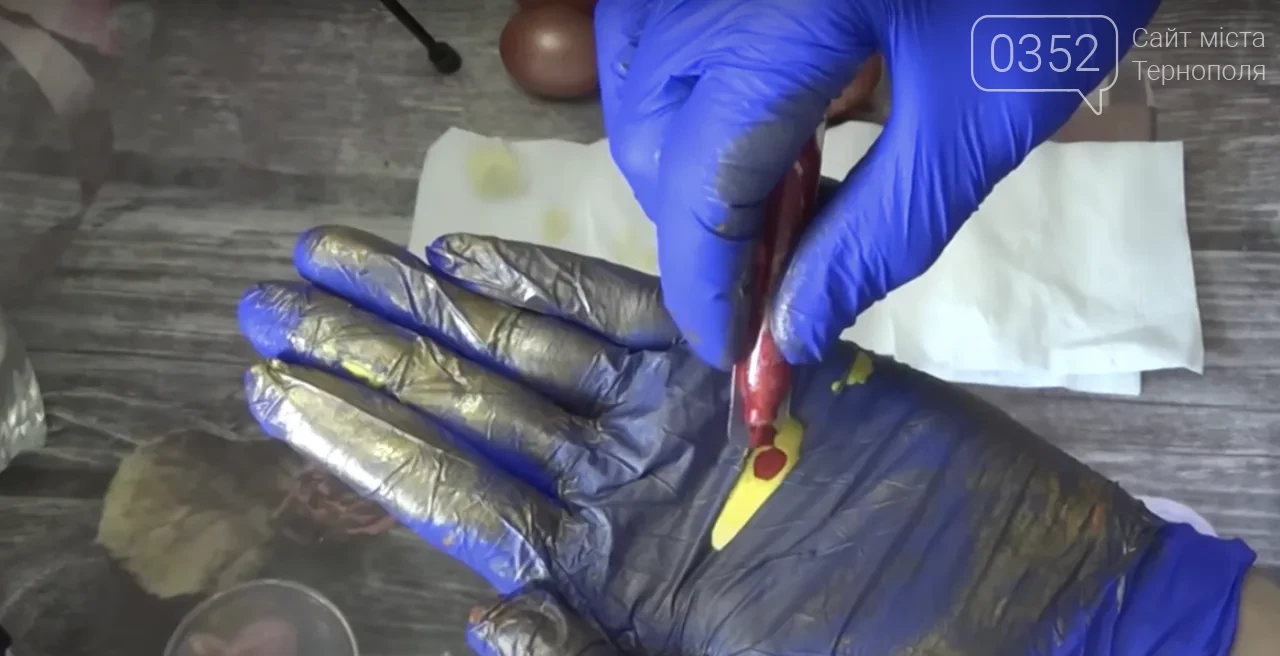 Далі надягають рукавички, наносять на долоню трохи жовтого і червоного барвника та акуратно натирають яйця цією сумішшю. Коли перший шар висохне, процедуру повторюють ще кілька разів — зазвичай 3–4, щоб колір став більш насиченим.