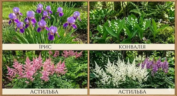 - Для глинистих ділянок, де затримується волога, найкраще підійдуть іриси, конвалії та астильби.