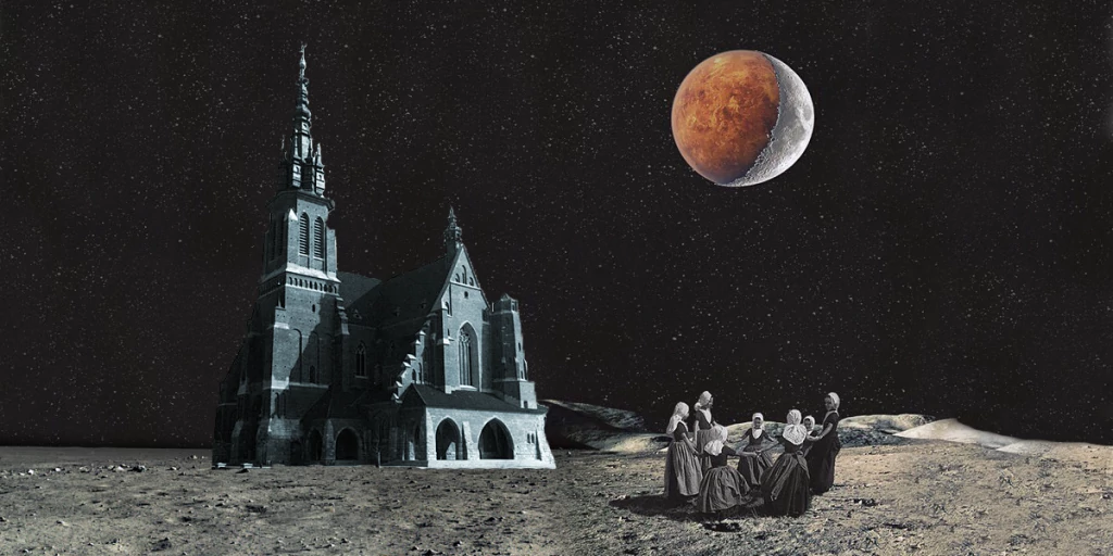 Дівчата танцюють у Ковелі біля костелу, а над ними летить диск. Можна уявити, що це 1930-ті, бо тоді його збудували. Колаж Олександра Котиса