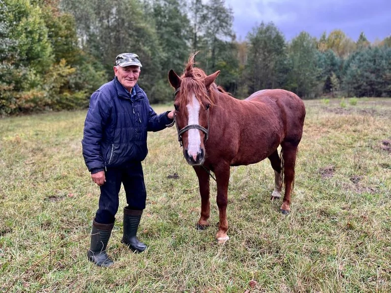 Дмитро Захарчук хазяйнує у хаті поруч із лісом спільно із Тетяною Завірюхою. “Є кінь, корова і Таня чорноброва”, — жартує чоловік. Оселитися разом вони вирішили 14 років тому. Пенсіонери кажуть: удвох легше справлятися з буденними справами.