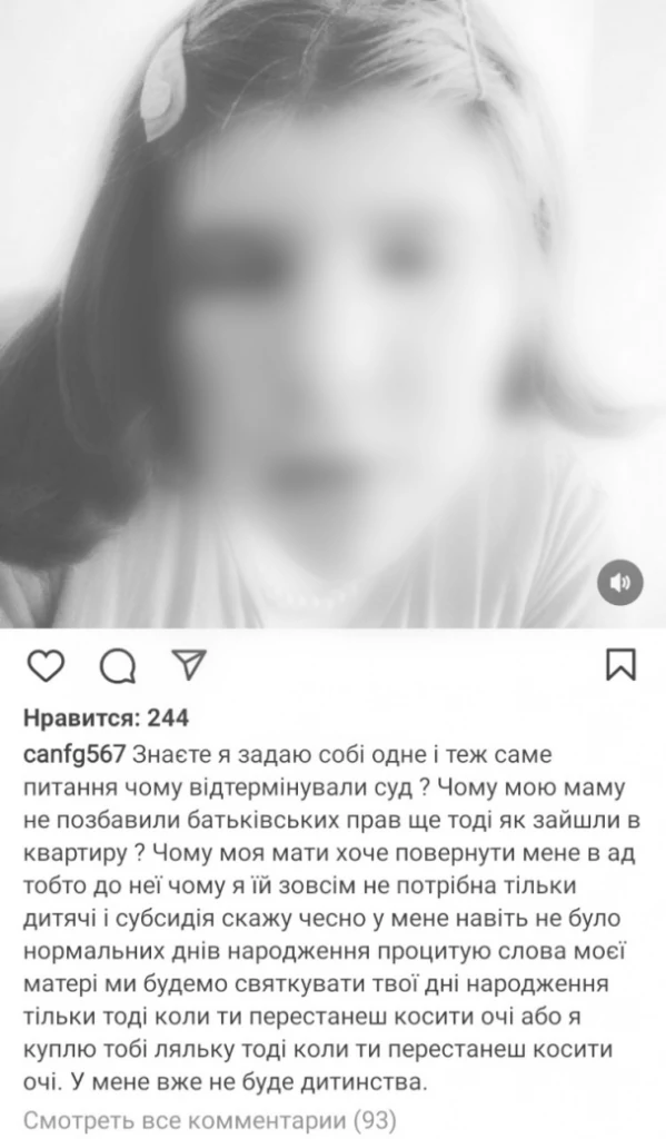 Сьогодні Анна-Марія оприлюднила новий, не менш зворушливий пост, де, серед іншого, написала таке: !Чому моя мати хоче повернути мене в пекло? Тобто до неї. Чому я їй зовсім не потрібна? Тільки дитячі і субсидія. Скажу чесно – у мене навіть не було нормальних днів народження. Процитую слова моєї матері: “Ми будемо святкувати твої дні народження тільки тоді, коли ти перестанеш косити очі. Або я куплю тобі ляльку тільки тоді, коли ти перестанеш косити очі. У мене вже не буде дитинства”.