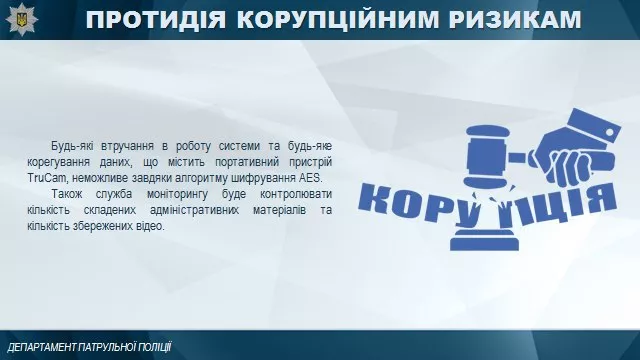 «З метою запобігання зловживань та корупційних ризиків, портативний пристрій TruCam містить алгоритм шифрування AES, що робить неможливим втручання в роботу системи та будь-яке корегування даних. Також служба моніторингу Департаменту патрульної поліції буде контролювати кількість складених адміністративних матеріалів та кількість збережених відео», — йдеться у повідомленні.