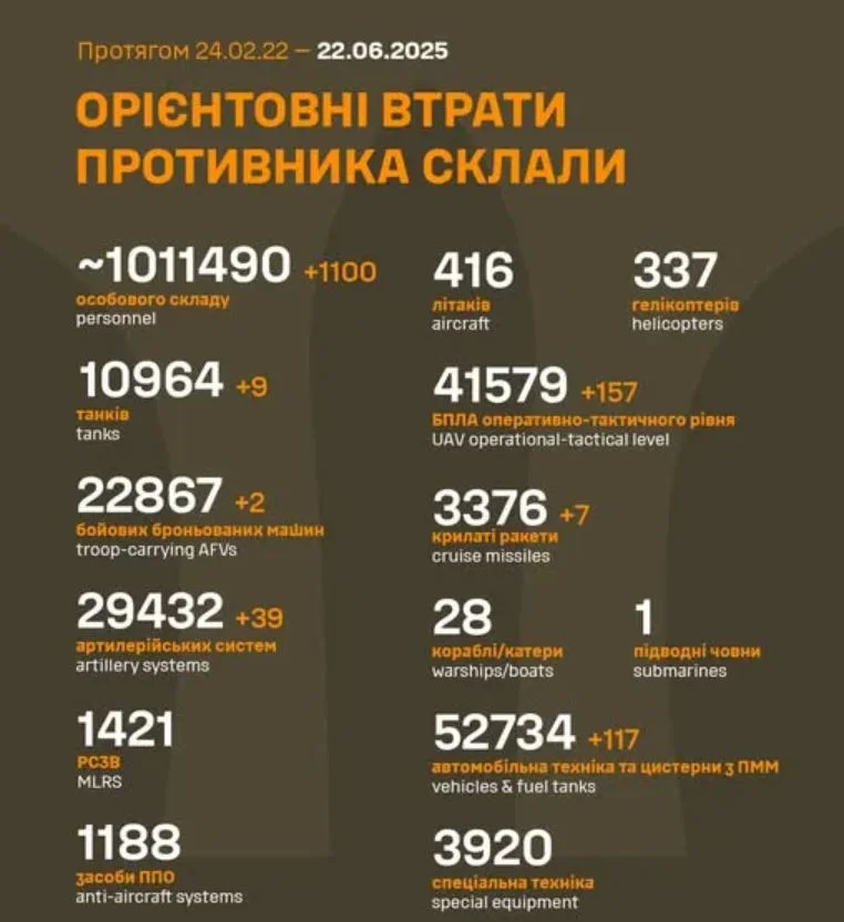 Загальні бойові втрати противника з 24.02.22 по 22.06.25 орієнтовно склали:
