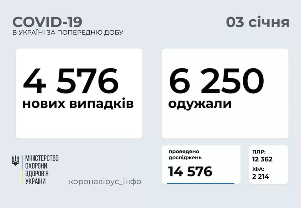 4 576 нових випадків коронавірусної хвороби COVID-19 зафіксовано в Україні станом на 3-тє січня. Зокрема, захворіли 158 дітей та 172 медпрацівники.