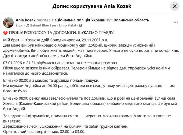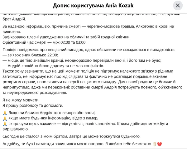 Рідні 18-річного Андрія, якого знайшли мертвим, закликають громадськість допомогти у встановленні обставин його загибелі. Сестра покійного, Анна Козак, опублікувала у фейсуці допис, у якому висловила сумніви щодо офіційних версій події.