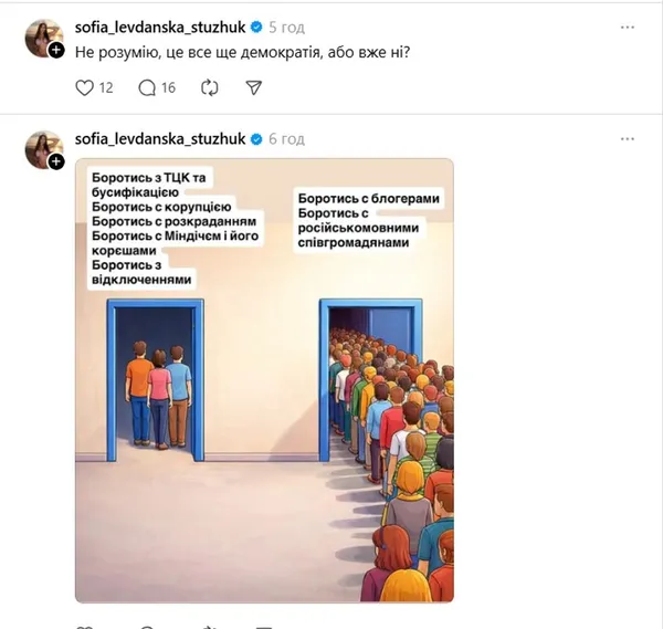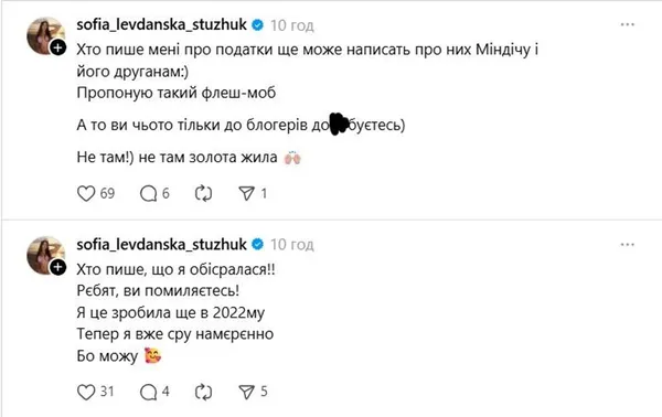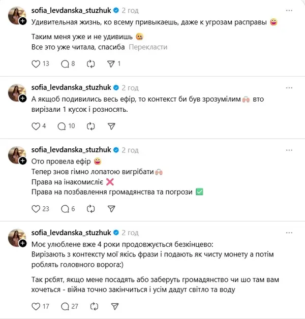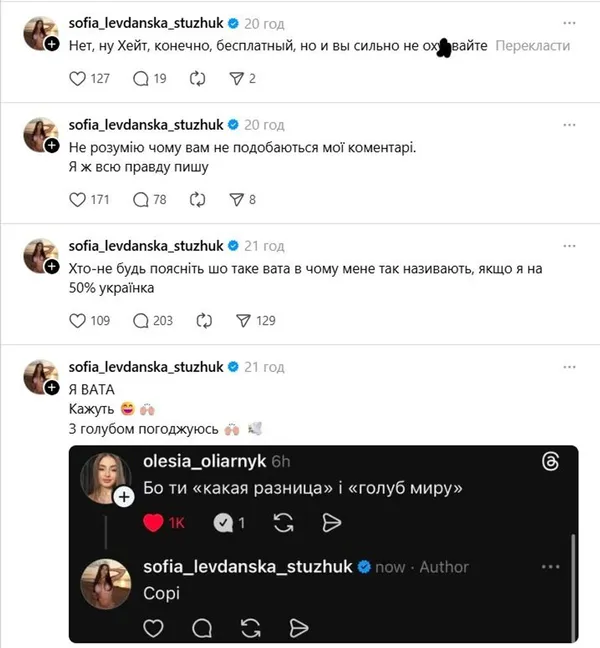 На своїй сторінці у Threads Стужук несподівано почала публікувати дописи українською мовою. Блогерка не розуміє, чому їй «не можна в українській інстаграм» і чому її називають «ватою» Коли ж Софію запитали, чому вона заговорила рідною мовою, та відповіла, що це «поклик душі».