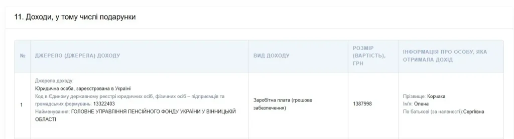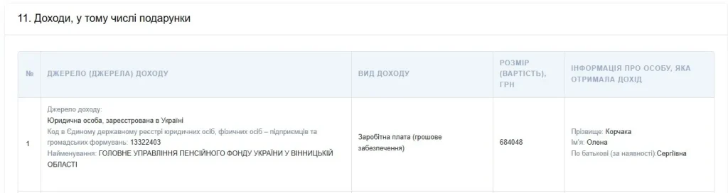 Олена Сергіївна Корчака, начальниця ГУ ПФУ у Вінницькій області – зарплата за рік зросла з 45 877 грн до 93 065 грн на місяць.