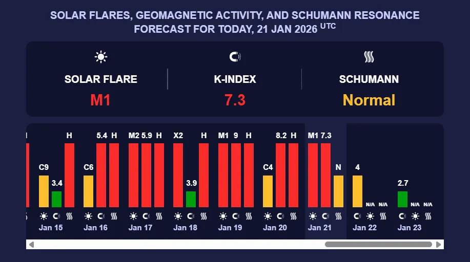 А у вівторок, 20-го січня, на Землі прогнозували сильну сонячну активність. За даними фахівців, магнітна буря сягала високого — червоного — рівня з К-індексом 7,7 із максимально можливих дев’яти.