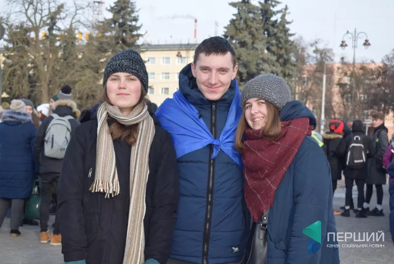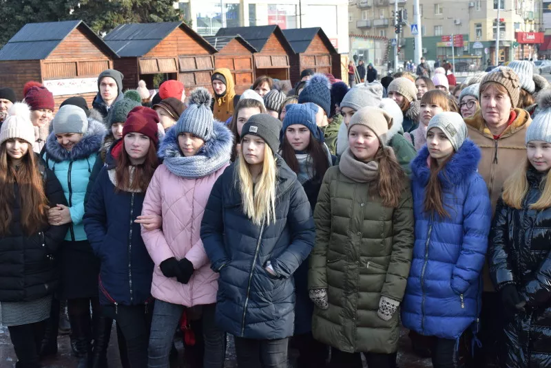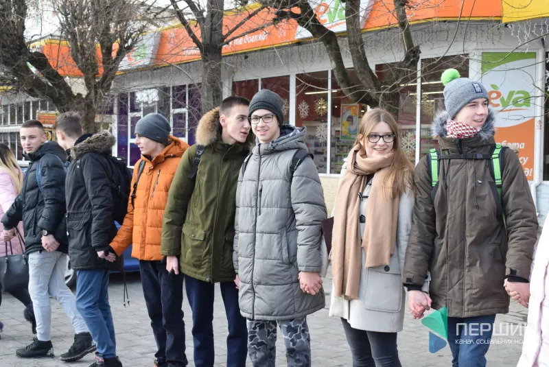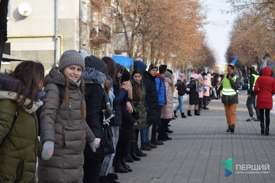 Школярі та студенти, чиновники, а також люди поважного віку приєднались до святкування Дня соборності України. Вони взялись за руки та утворили ланцюг, що простягнувся від Театрального майдану і майже до кінця вулиці Лесі Українки. Це близько 700 метрів.