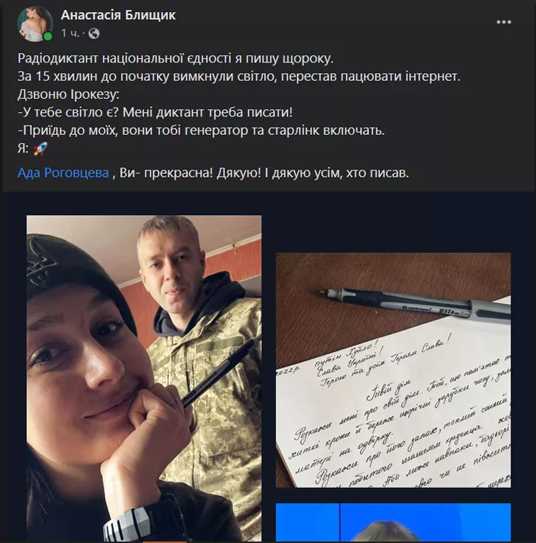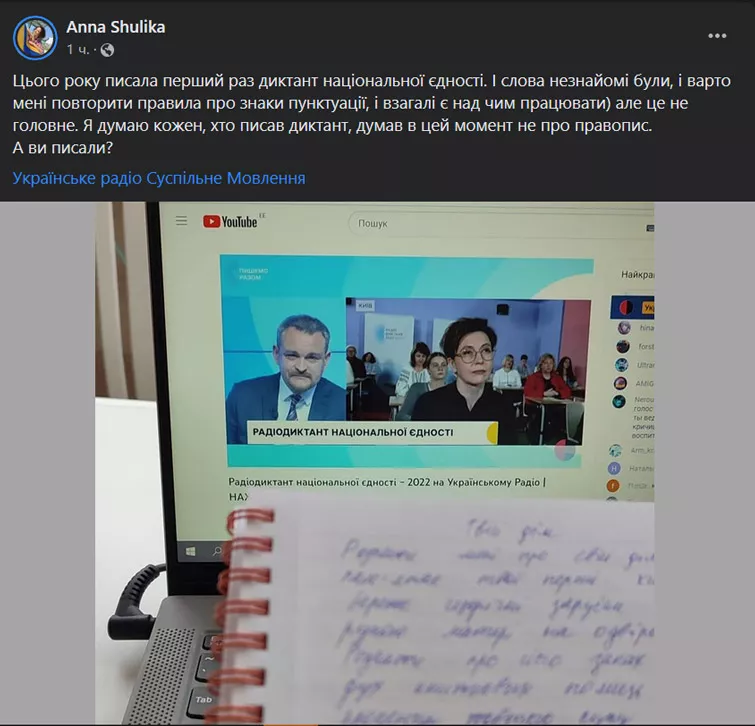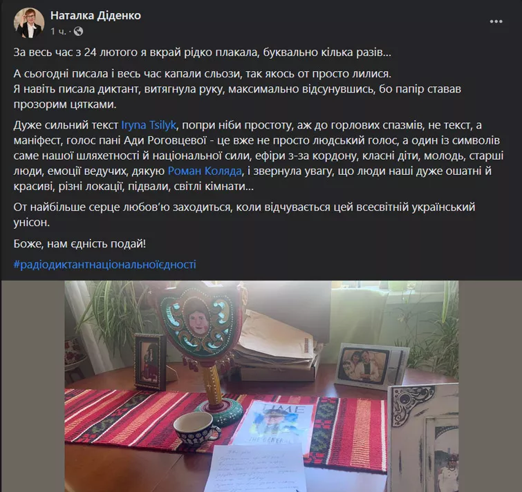 “Дивилася, як люди в різних куточках України, в катакомбах, аудиторіях, бібліотеках, а також далеких світах інших країн пишуть Радіодиктант, і плакала весь час”, – пише вона.