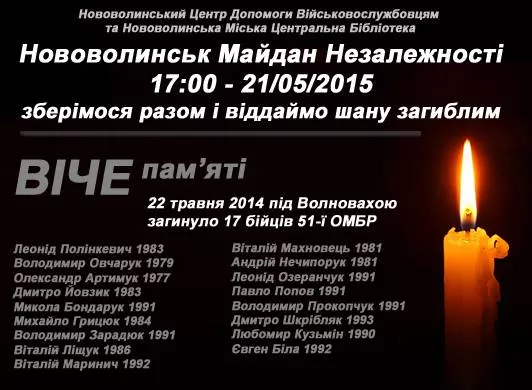 Під час трагедії під Волновахою 22 травня 2014 року загинули 17 бійців 51-ї окремої механізованої бригади. У ніч із 21 на 22 травня (за іншою інформацією ближче до ранку) на табір 50-ї окремої механізованої бригади ЗСУ, що знаходилась між селищами Ольгинка та Володимирівка, напали бойовики ДНР. Втрати у бою під ...