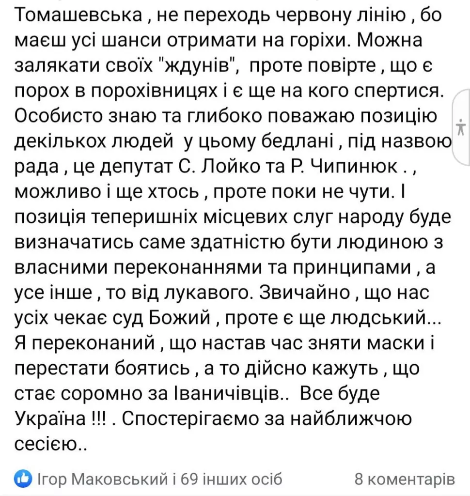 Напевно, що путін та путінізм, як хвороба, розповзлася кругом, включаючи Іваничі. Одні, втративши гідність бійця, носячи військову форму, вимолюють собі право ховатись в тилу, інші, прикрившись бажанням щось змінити, самі, мов воші, ховаються у своєму кожусі.
