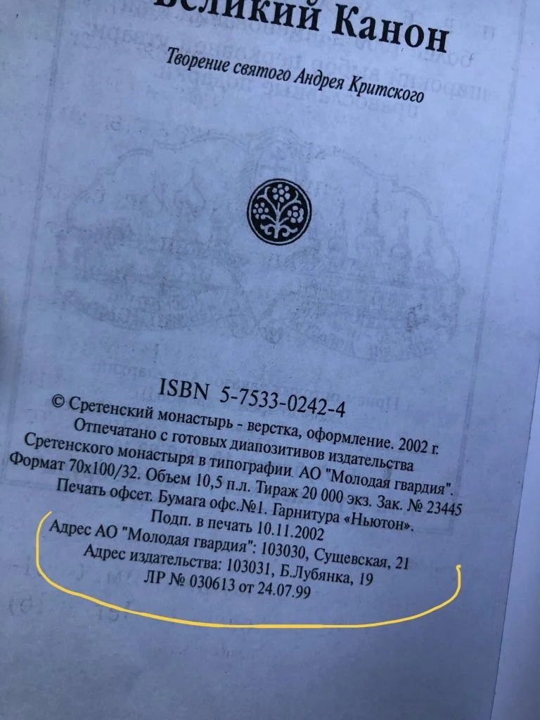 Адресу видавництва, під назвою «молодая гвардия» (дуже іронічно, коли совковий неймінг має структура, котра знаходиться на території сретенського монастиря) вказано (УВАГА) без міста та країни.
