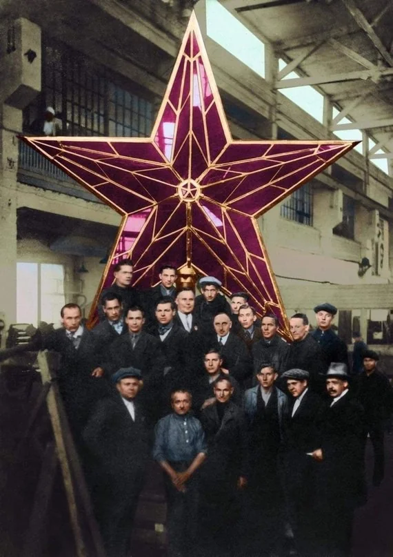 На фото – робітники вкраденого “бельгійського” заводу, що виготовили “рубінові зірки” для кремля…