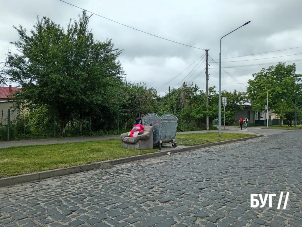 На одній із вулиць Володимира виявили кумедну картину — покинуте крісло з яскравою рожевою іграшкою, що сумує біля сміттєвих баків.