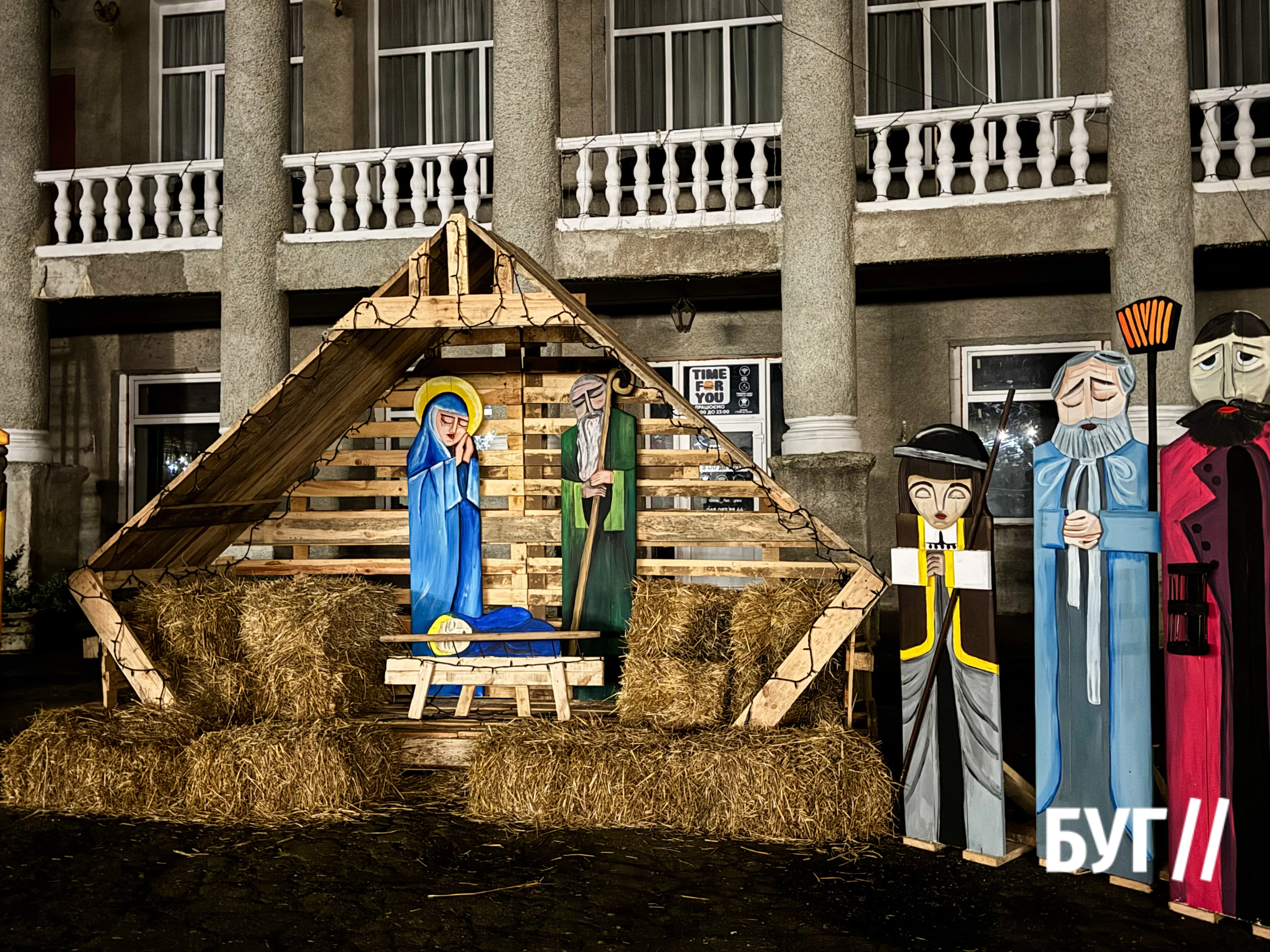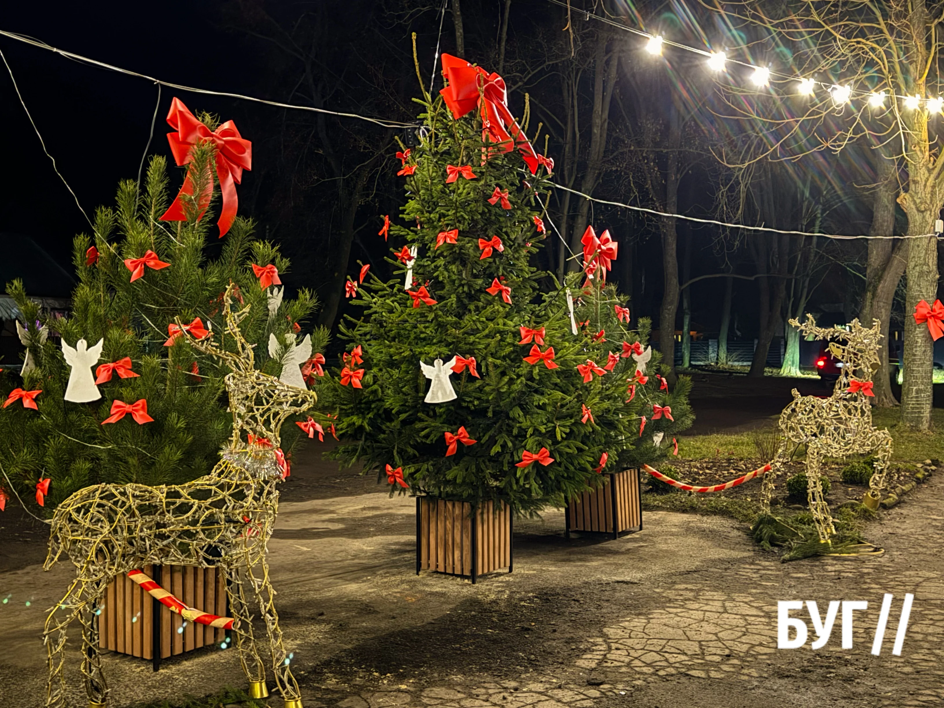 Сквер прикрасили ялинкою, різдвяною шопкою та яскравими гірляндами. Світлові вогники м’яко підсвічують територію, створюючи святковий настрій і додаючи локації особливої чарівності у вечірній час.