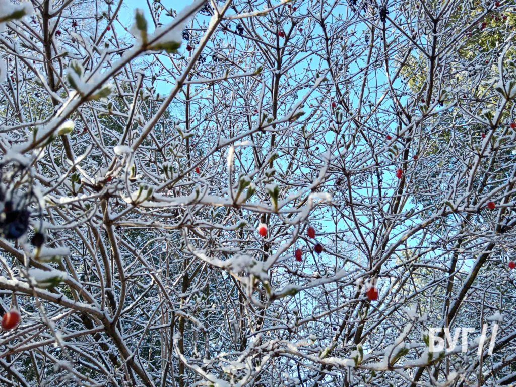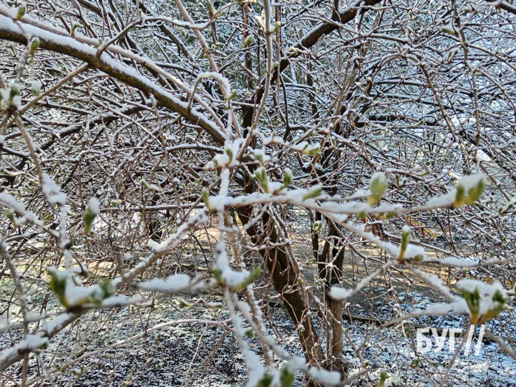 10-го квітня у Володимирі випав сніг. Через нічні опади дерева та кущі вкрилися снігом, зокрема калина біля одного з дитячих садків.