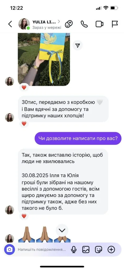 «От саме в такий нелегкий момент (коли твій розплавлений безкінечним болем мозок не хоче уже нічого) я і отримала повідомлення від Юлії. Зовсім не знайома мені дівчинка написала і просила про зустріч. Сказала, що хоче дещо передати. Я просила перенести зустріч, і запитала що це має бути за передача та від кого. Юля відповіла, що вона з коханим хоче передати кошти для наших Мужніх», – розповідає волонтерка.