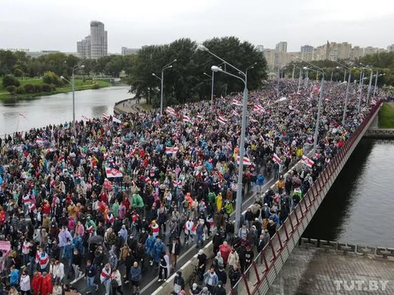 В акції протесту проти фальсифікації виборів президента в Мінську 27-го вересня бере участь близько 100 тисяч осіб, десятки людей затримано. Про це повідомляють: білоруська служба Радіо Свобода, TUT.BY, Весна, Інтерфакс, пише Українська права. Радіо Свобода й Інтерфакс повідомляють, що в мітингу в