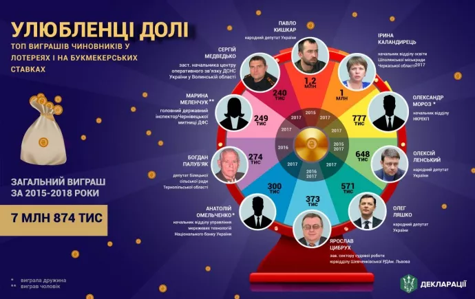 Українські чиновники в 2015-2018 роках вказали в своїх деклараціях виграші в лотереї і на букмекерських ставках в розмірі 7,874 мільйона гривень. Про це повідомляють "Наші гроші". Найбільшу суму від виграшу в лотерею задекларував народний депутат від "Самопомочі" Павло Кишкар. У своїй декларації за 2015 рік він ...